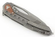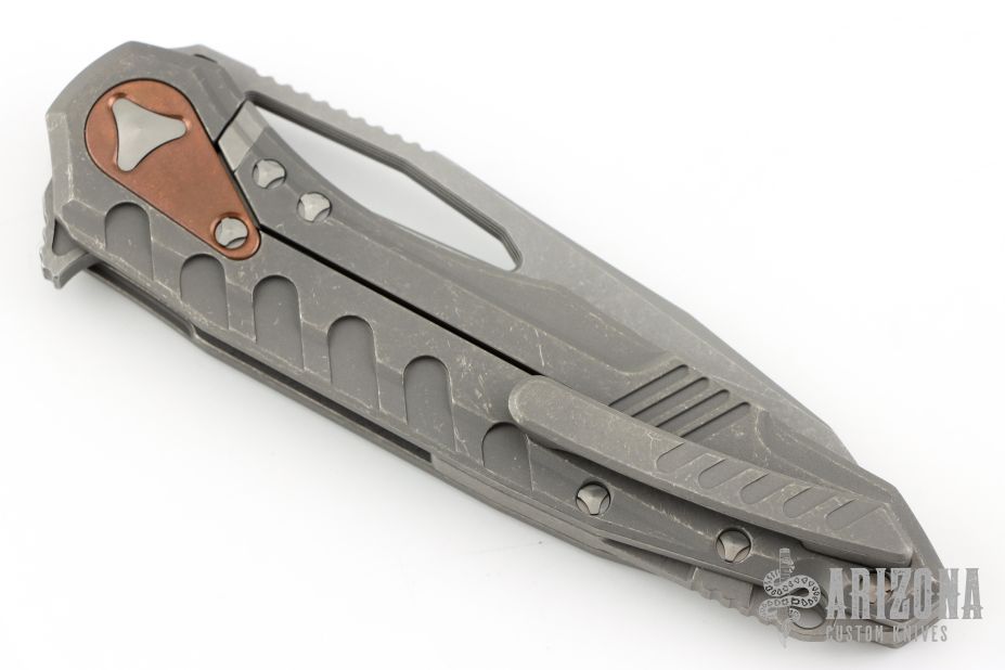 This Sigil MK6 by Microtech Knives features an Apocalyptic finished blade with thumb hole and flipper, notched thumbrest. The handle has an Apocalyptic finished titanium frame, tip up clip and backspacer with a distressed copper overtravel stop, stainless lockface insert. Comes with original box and papers. S/N 0698 and dated 04/2017. Excellent Condition.