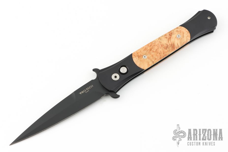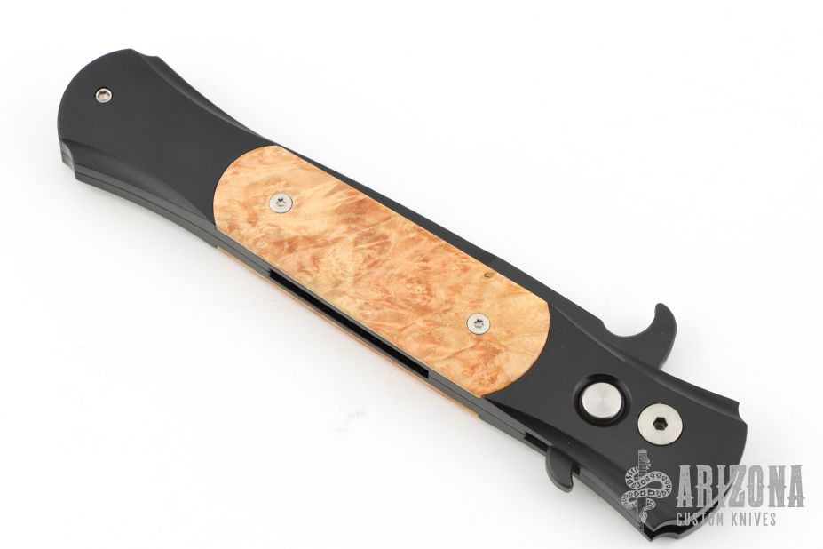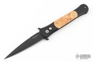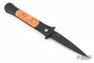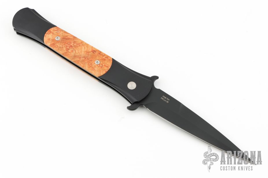 "Classic styling, modern 3D CNC Machining, and unequaled craftsmanship have all come together perfectly for our newest auto knife? THE DON. The frames and inlays for each DON are completely 3D machined, curved and fluted for a completely custom feel. Super smooth coil spring action! Because of the complex machining and amount of detailed hand work involved with the DON, their production will be very limited each year." This Large Don features a black finished blade with false top edge. The handle has a black aluminum frame with maple burl inlays. FPR S/N 95. Excellent condition.