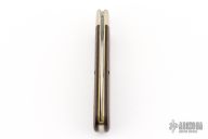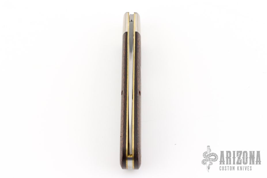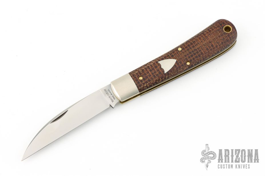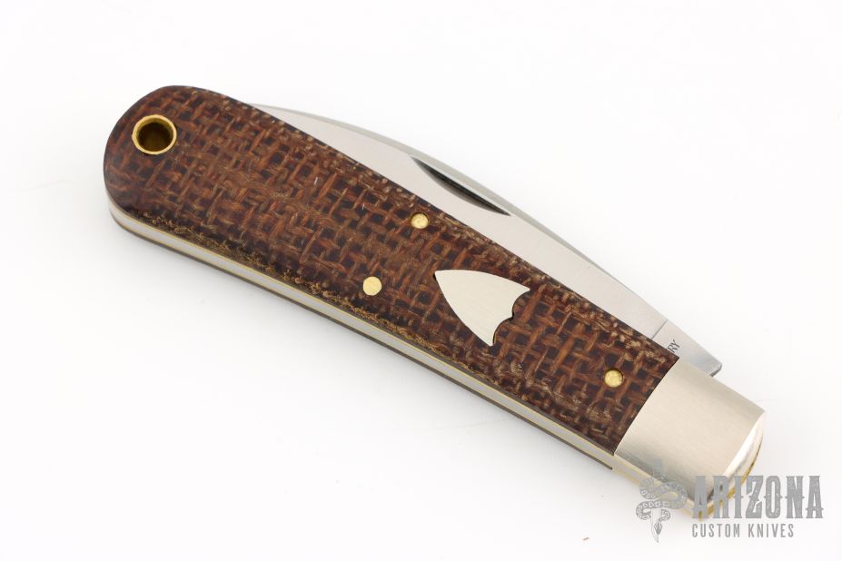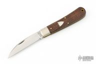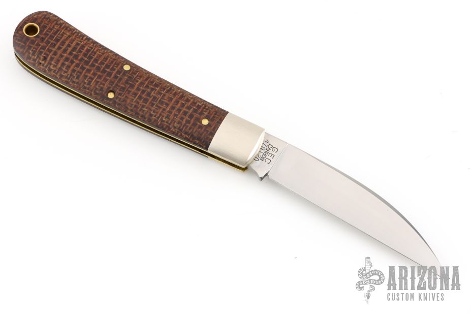 This knife by Great Eastern Cutlery features a satin finished blade with nail nick. The handle has pinched steel bolsters and brass liners, burlap covers. Comes with original packaging and button. Excellent condition.