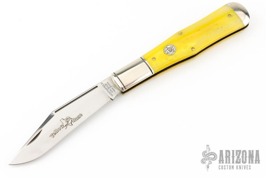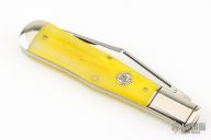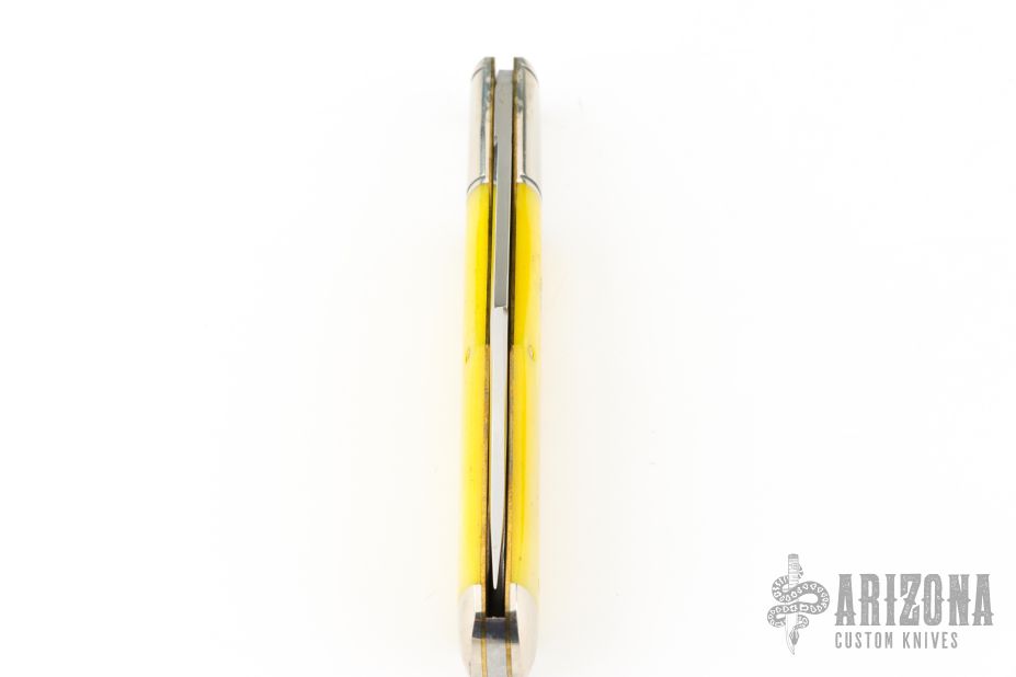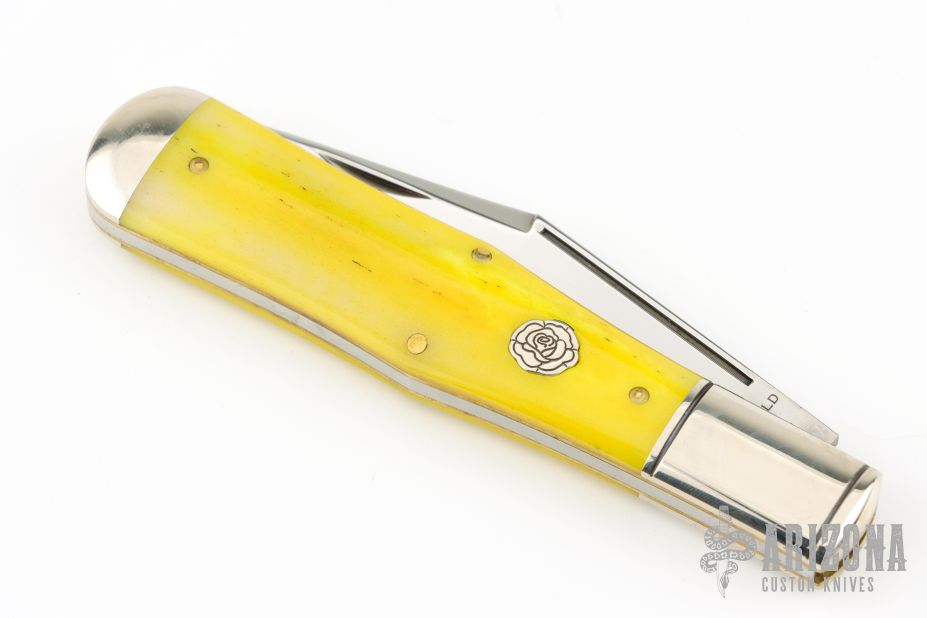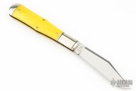 This slipjoint by Great Eastern Cutlery features a polished clip point blade with a nail nick.  The handle has nickel silver bolsters, smooth yellow rose bone covers, brass liners and steel spring. Has half-stop. Includes original knife tube, paper, and button. Excellent Condition.