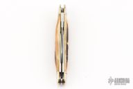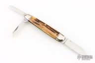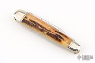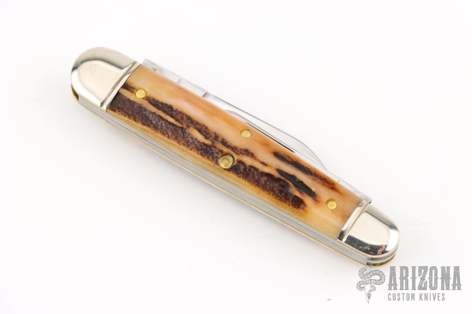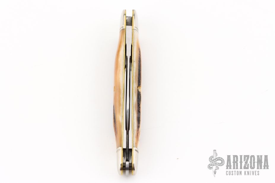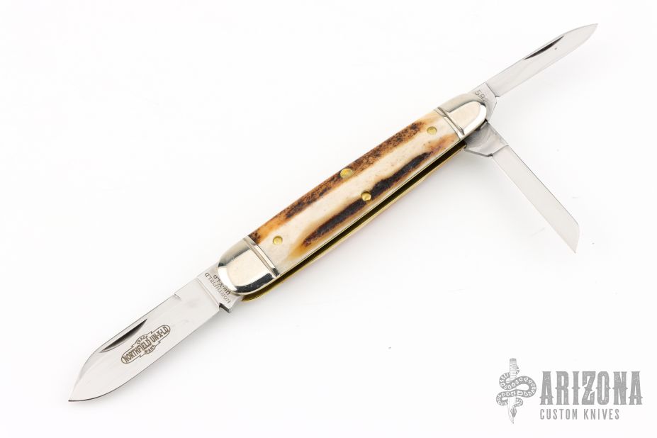 This Farm Whittler by Northfield Knives features polished blades with nail nicks. The handle has nickel silver fluted bolsters, sambar stag covers, brass liners/pins. Has half stops. Comes with original tube, and paper. Excellent condition.