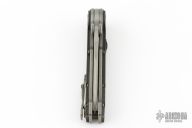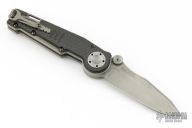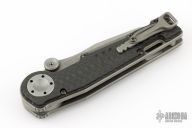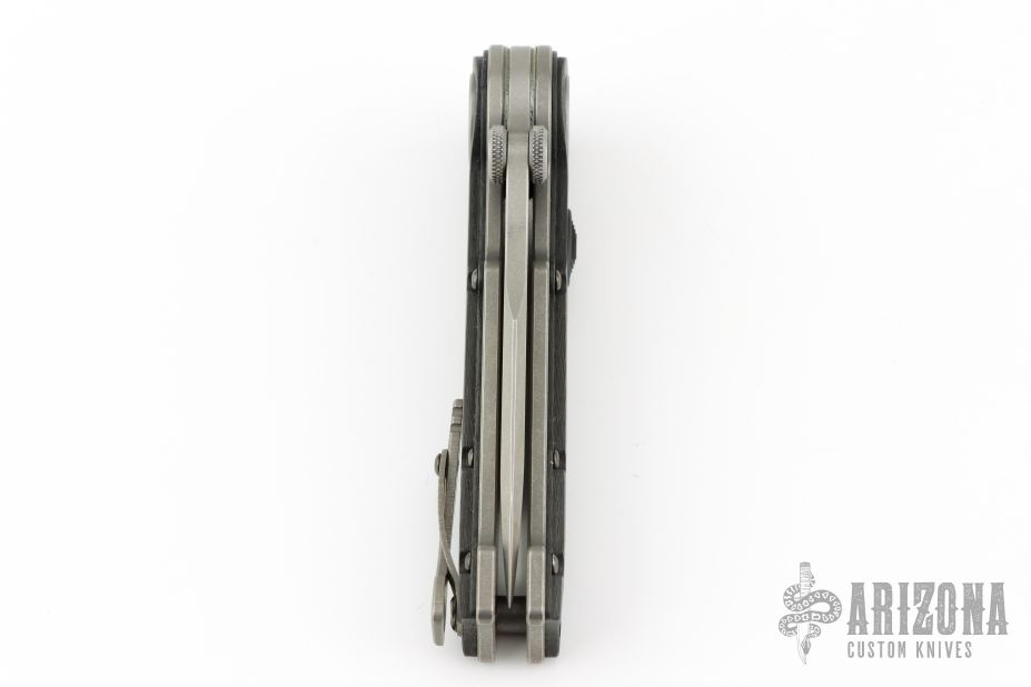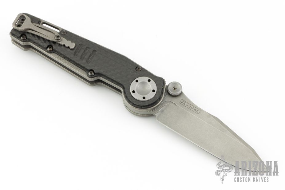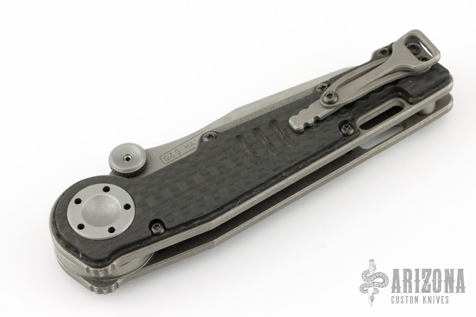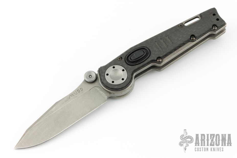 This MUDD folder from Grant and Gavin Hawk features a stonewashed spear point blade with dual thumbstuds. The handle has carbon fiber overlays, tumble finished titanium frame, tip up tumble finished titanium clip. Nice lockup and blade seating. Has some light scuffs and scratches, great condition otherwise.