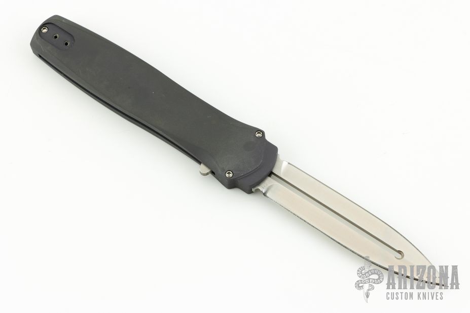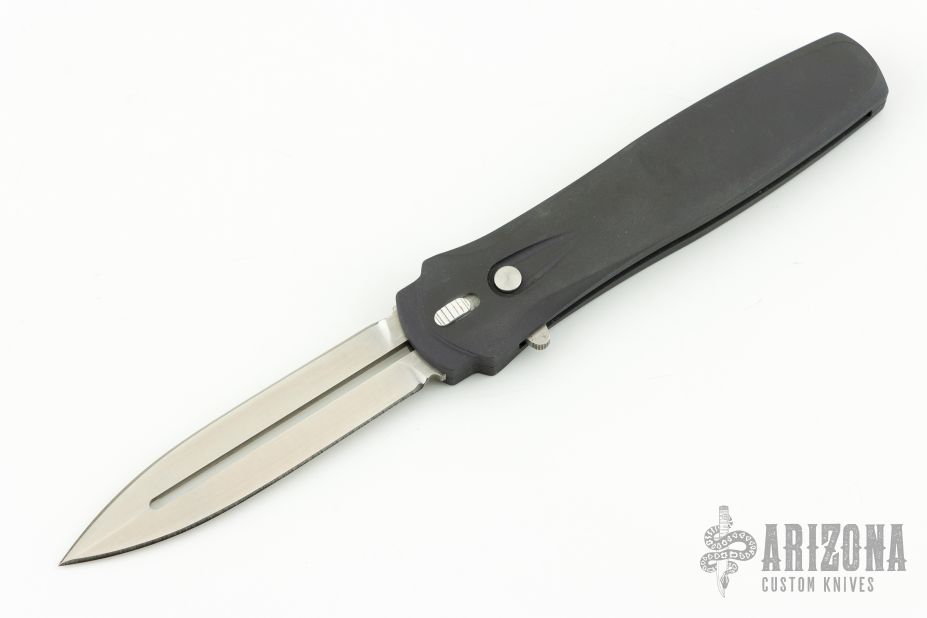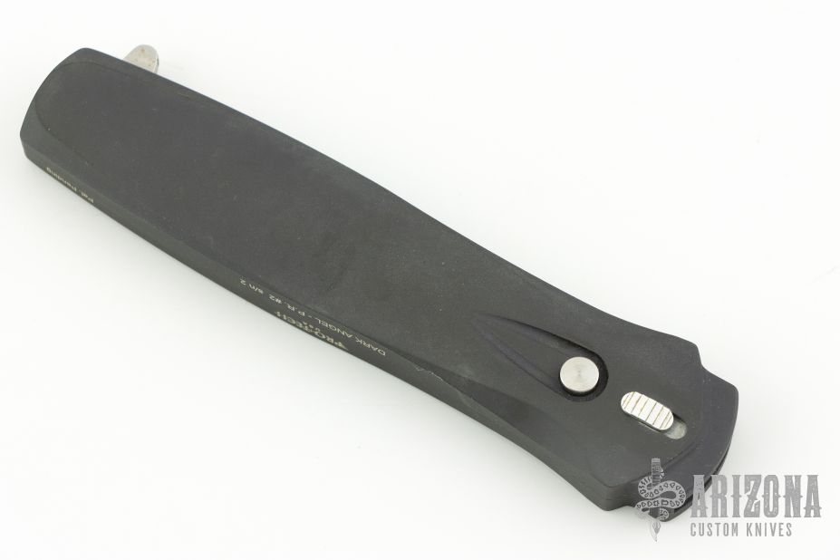 This is a Dark Angel single action out the front auto by Pro-Tech Knives features a satin finished double edged blade and black anodized aluminum handle. Safety switch. Production run #2 s/n 2. Has some scuffs on the frame, the clip is missing, otherwise good condition.