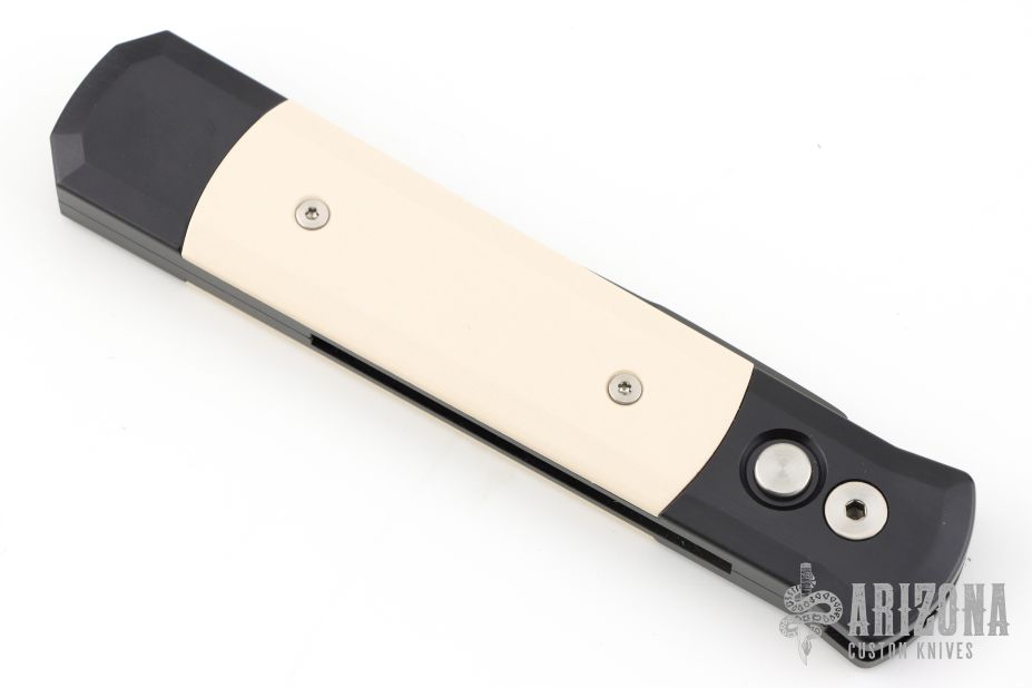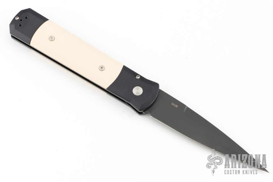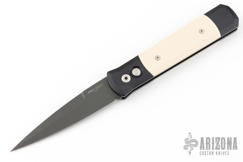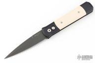 The Godfather 4" blade auto knife represents the influence of original Italian "Stilletto" style auto knife and Pro-Tech's modern coil spring precision. This Godfather Tuxedo has a black coated blade and anodized black handle with ivory micarta inlays. The clip is missing, otherwise excellent condition.