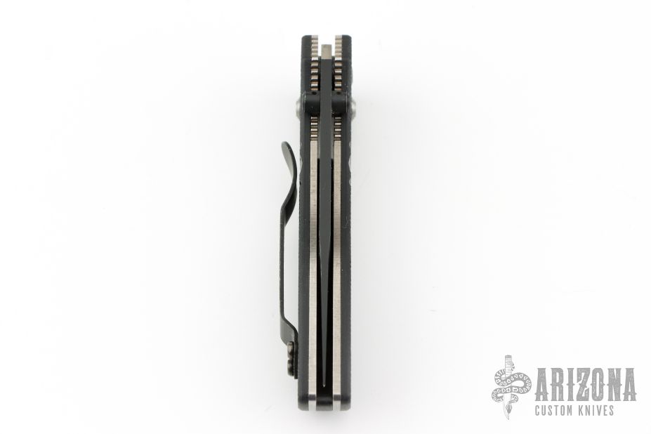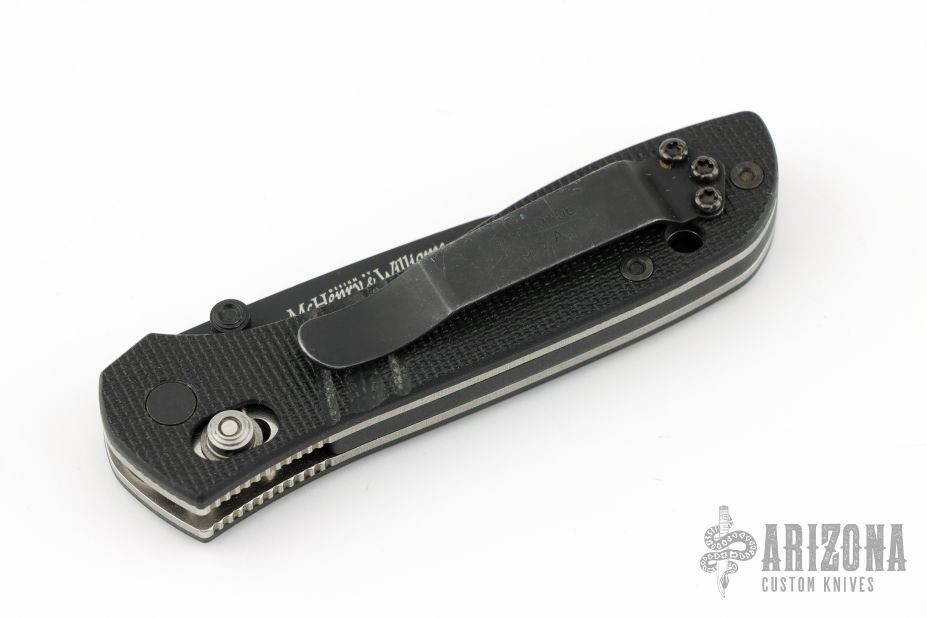 McHenry & Williams design. Axis lock. Black blade with dual thumbstuds. The handle has black G-10 scales with stonewashed stainless steel liners, black backspacer and a tip up stainless clip, left or right reversible. Discontinued model. First Production Run 0546/1000. Includes original box. Excellent condition.