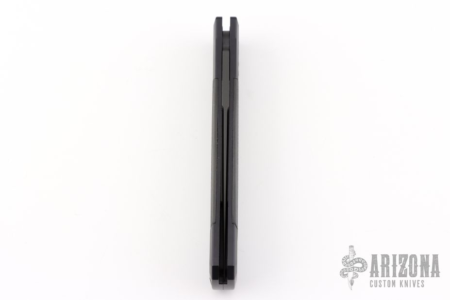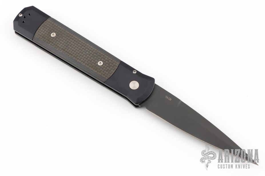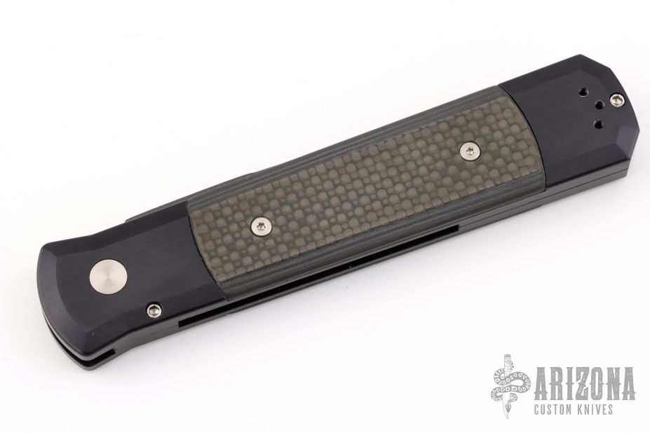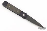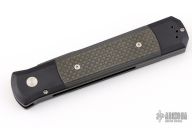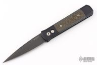 This Godfather automatic knife by Pro-Tech has a black blade, black aluminum frame and carbon fiber inlays. The clip is missing, otherwise excellent condition.