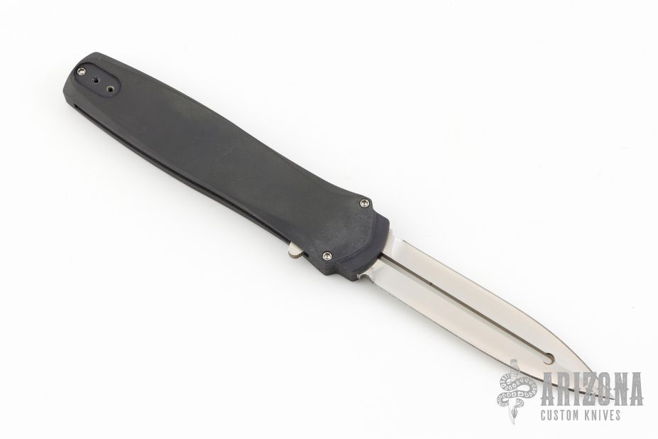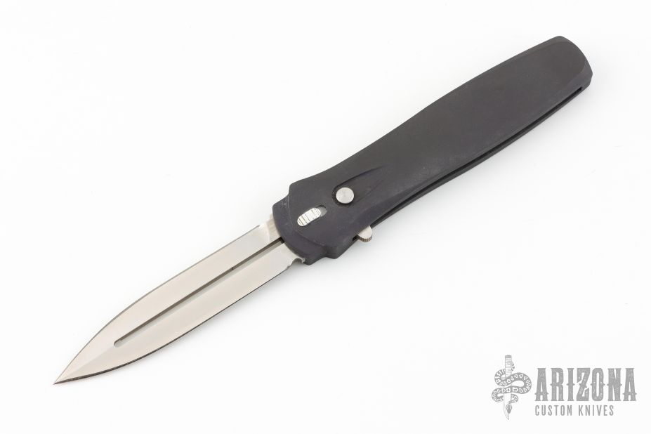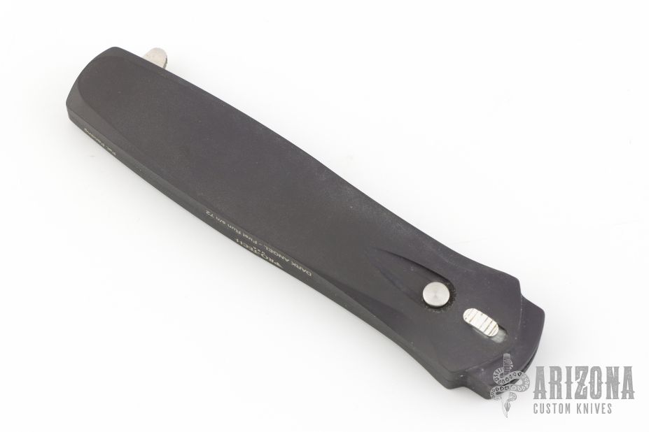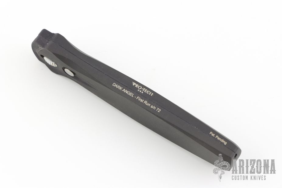 This is a Dark Angel single action out the front auto by Pro-Tech Knives features a satin finished double edged blade and black anodized aluminum handle. Safety switch. First Production Run s/n 72. Has some light scuffs on the frame, the clip is missing, otherwise good condition.