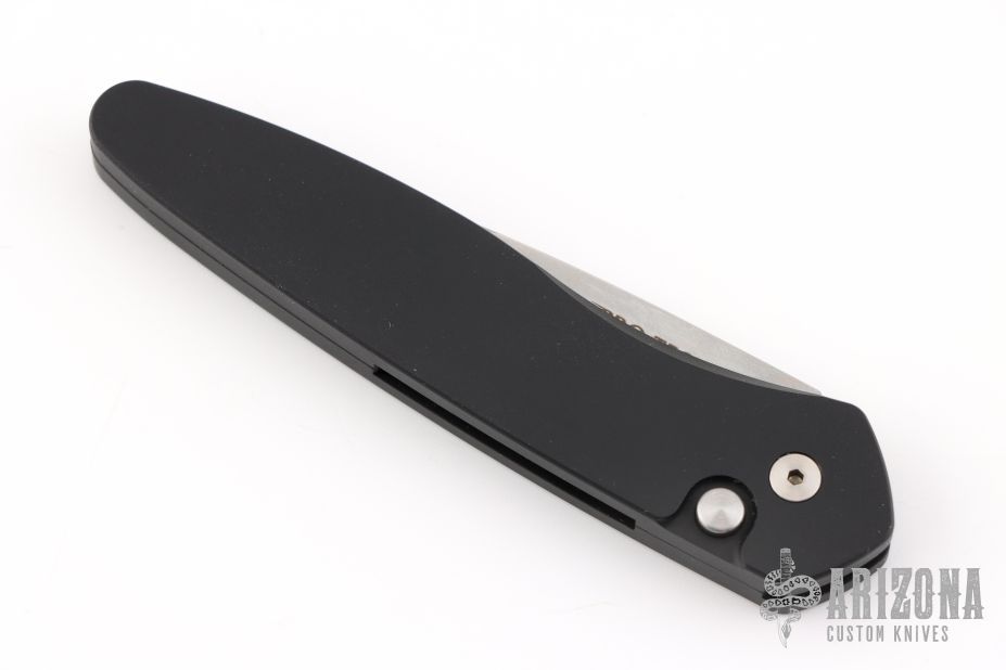 This Newport by ProTech Knives features a stonewashed spearpoint blade and black aluminum handle PR1 #53. The clip is missing, otherwise excellent condition.
