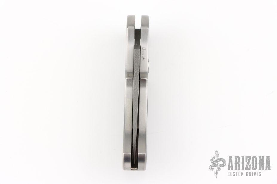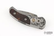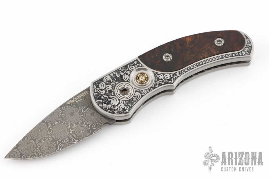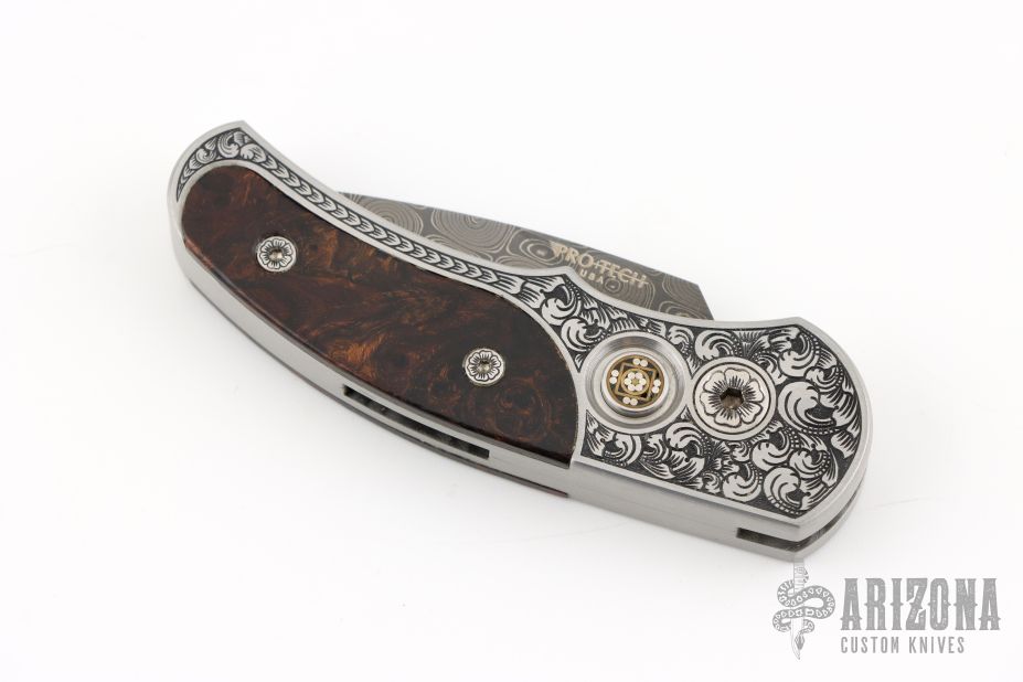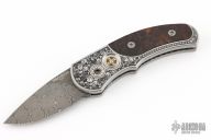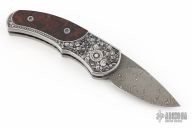 It is very difficult to call this Ultimate Runt J4 a production knife when so much custom work and talent went into its creation. The stainless steel Nichols Damascus has a great pattern and the Bruce Shaw fully engraved frame is richly and exquisitely detailed - magnificent; even the pivot pin is engraved. The desert ironwood burl used for the frame and a mosaic push button inlay. Excellent condition.