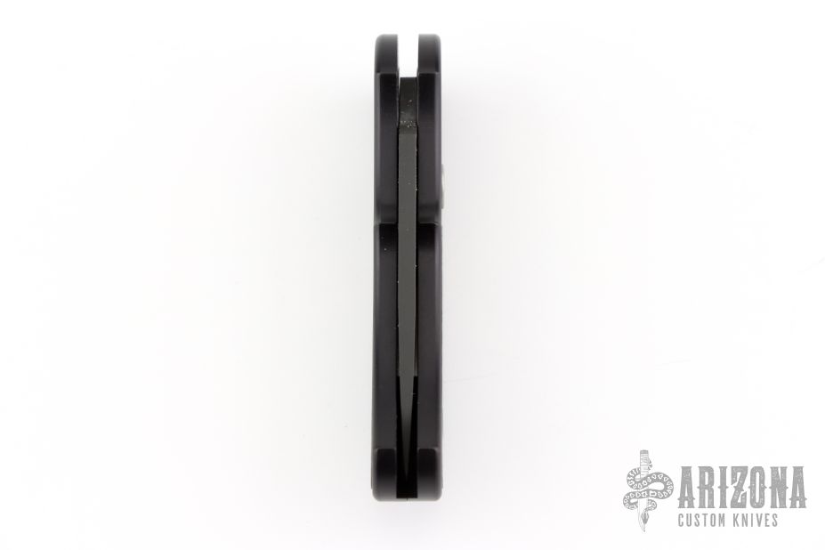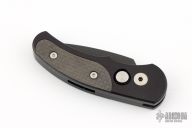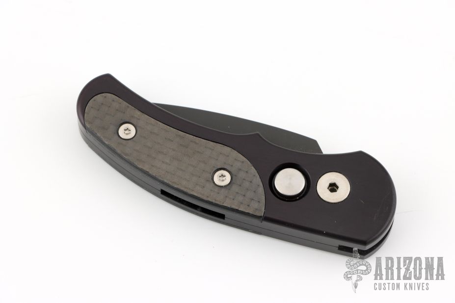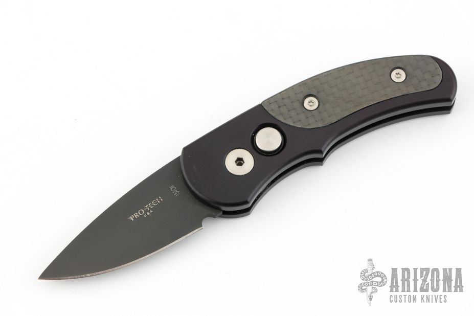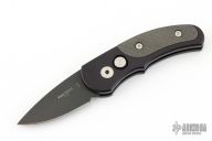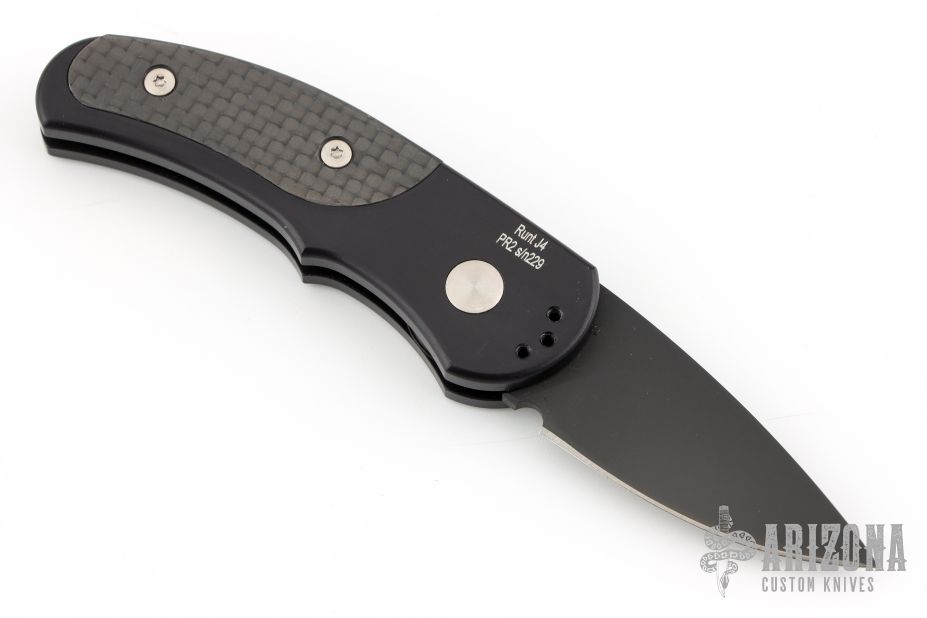 This is a Runt J4 "Jalapeno" by Pro-Tech featuring a black handle with carbon fiber inlays and a black blade. Coil spring. California legal. PR2 and s/n 229. The clip is missing, otherwise excellent condition.