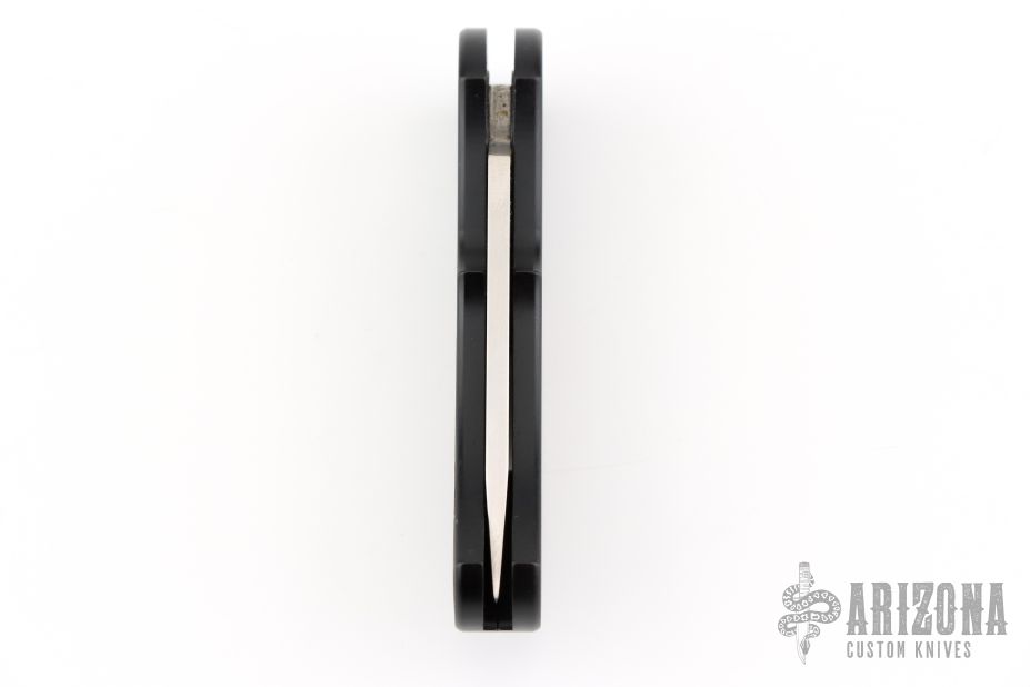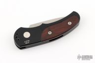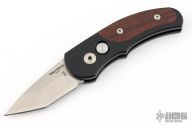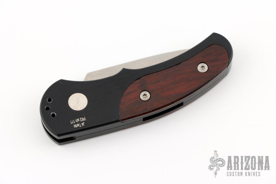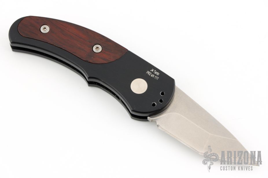 This is a Runt J4 "Jalapeno" by Pro-Tech featuring a black aluminum handle with cocobolo inlays and a stonewashed tanto blade. Coil spring. California legal. PR2 s/n 111. Has a couple light scratches, the clip is missing, otherwise good condition.