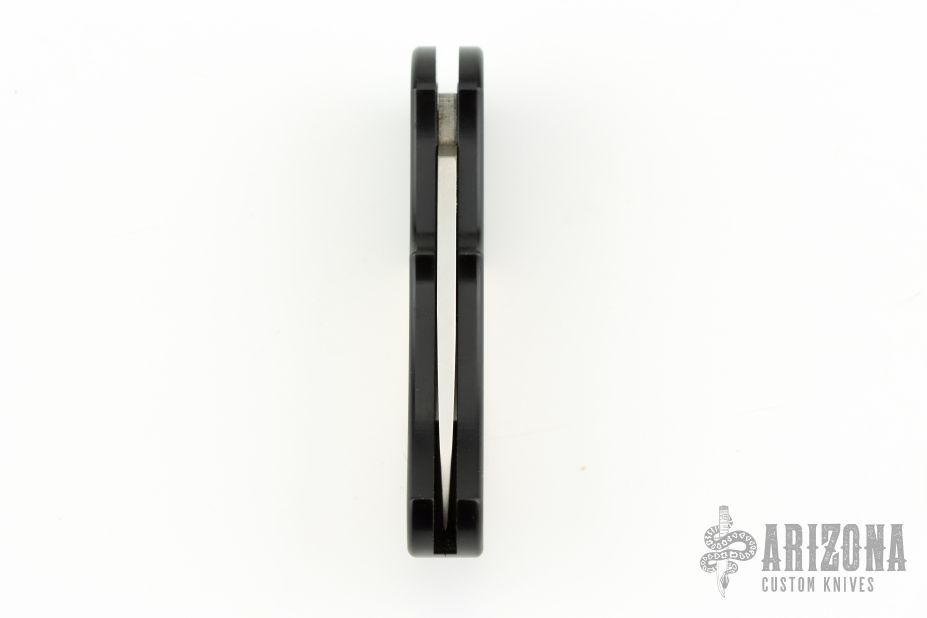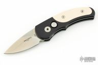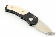 This is a Runt J4 "Jalapeno" by Pro-Tech featuring a black handle with ivory paper micarta inlays and a satin blade. Coil spring. California legal. FPR and s/n 40. The clip is missing, otherwise excellent condition.