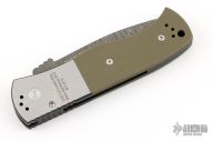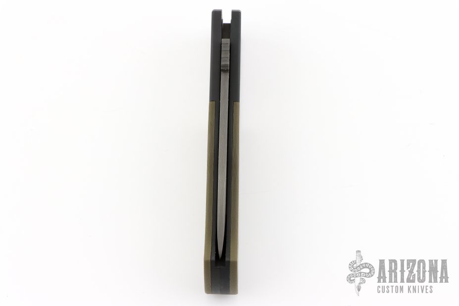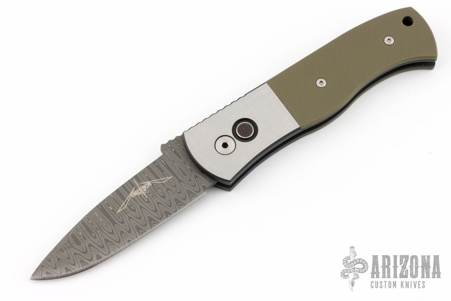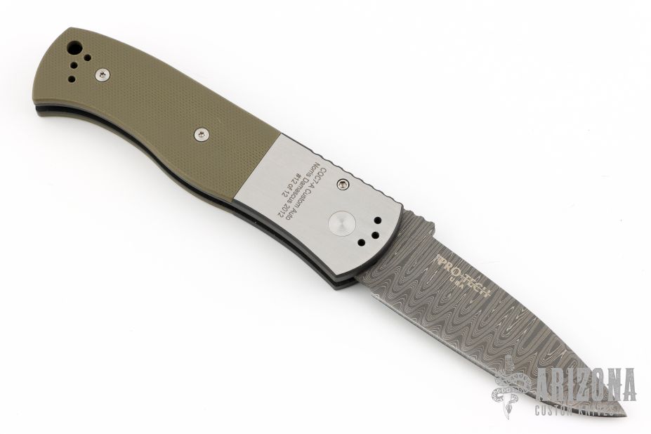 This CQC7 Auto by Pro-tech and Emerson features a Mike Norris Damascus blade with notched thumbramp. The handle has a stainless steel frame with green G-10 inlays, carbon fiber inlay in push button. Nice lockup, action and blade seating. Comes with original sheath. The clip is missing, othewise excellent condition.