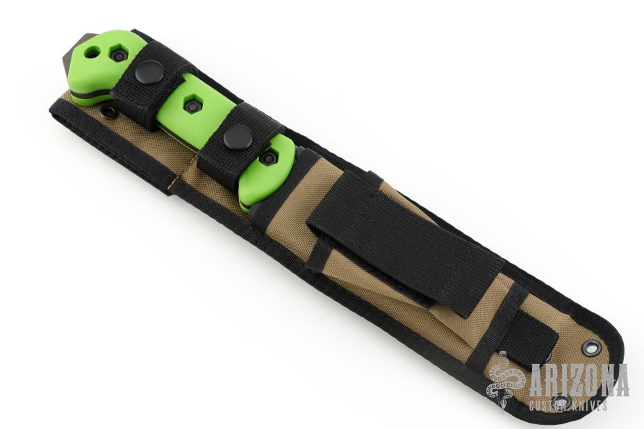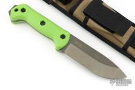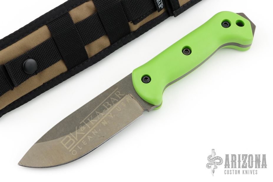 This BK-2 from Becker Knife & Tool features a clear coated drop point blade, .259" blade stock and 1.663" blade depth, full tang construction. The handle is comprised of green scales over full tang construction with lanyard hole in pommel. Incudes original box, papers and sheath. Excellent condition.