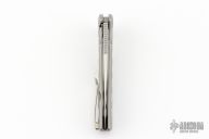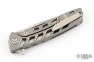 This Evo Typhoon from Brian Nadeau features a satin finished blade with a fullers, flipper and thumbrest. The handle is comprised of a bead blasted titanium frame that is "Aspirated", satin titanium tip up clip. Rides on bearings, nice detent, lockup and blade seating, stainless lockface insert. Comes with original box, Excellent condition.