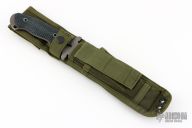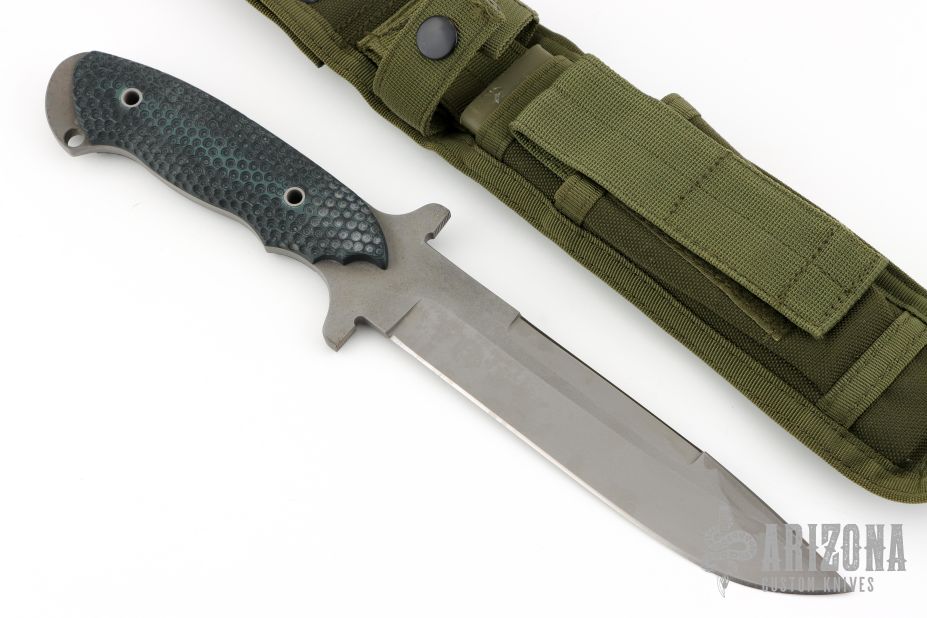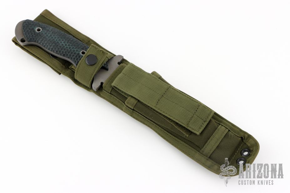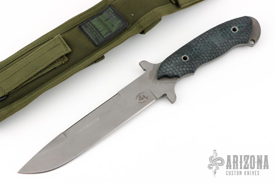 This Custom Combat Raven by Rob Simonich features a grey coated blade with sharpened top edge, .212" blade stock and 1.303" blade depth, full tang construction. The handle has gunner grip black G-10 scales, extended tang with lanyard hole. Comes with nylon sheath. Has some scuffs, and a couple stained spots on the blade, otherwise excellent condition.