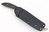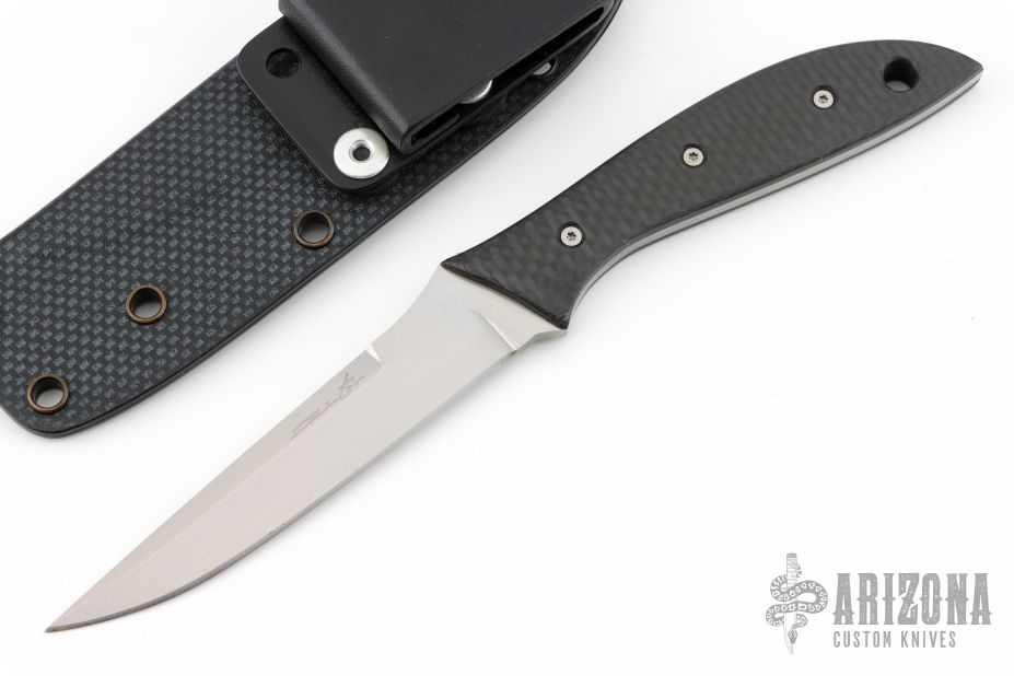 This Fixed Tighe by Brian Tighe features a hand rub satin finished blade with false top edge, .131" blade stock and .904" blade depth, full tang construction. The handle has carbon fiber scales. Comes with a kydex sheath. Has a few light scratches, otherwise excellent condition.