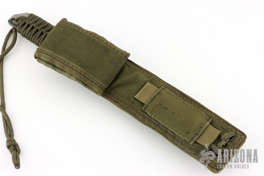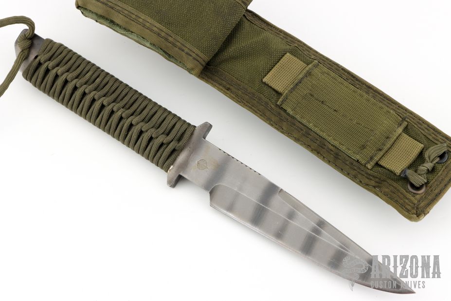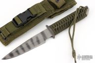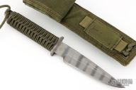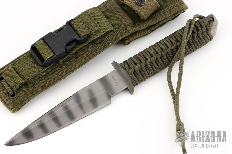 This BG by Strider features a tiger striped blade with sharpened top edge and a notched thumbrest, .250" blade stock and 1.252" blade depth, full tang construction. The handle has paracord wrap. Comes with a nylon tactical sheath. Has some light scuffs and scratches, excellent condition otherwise.
