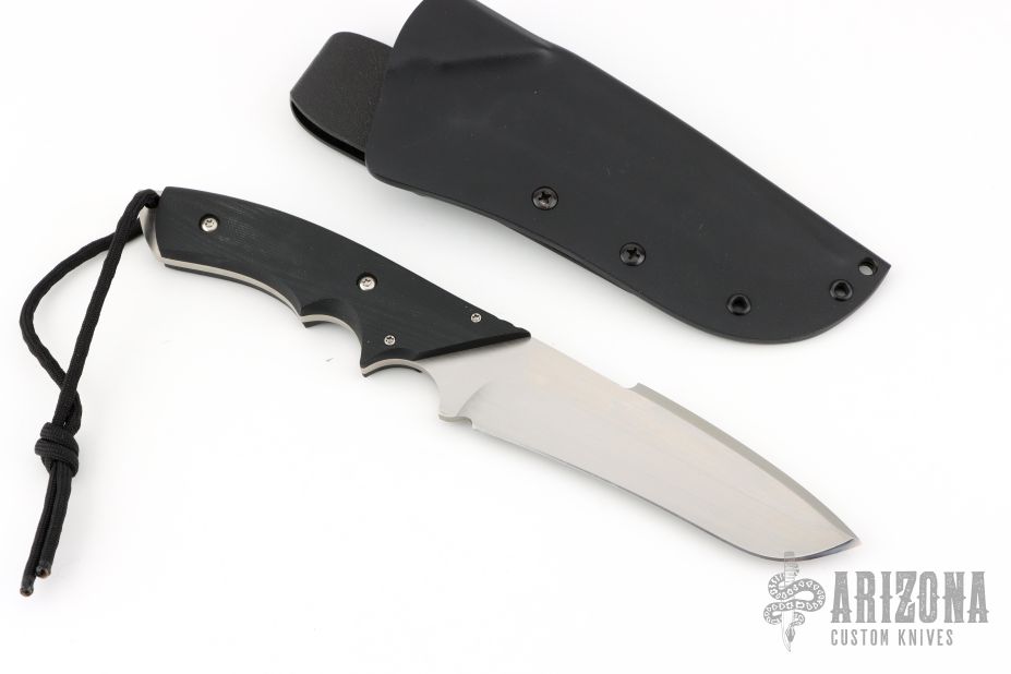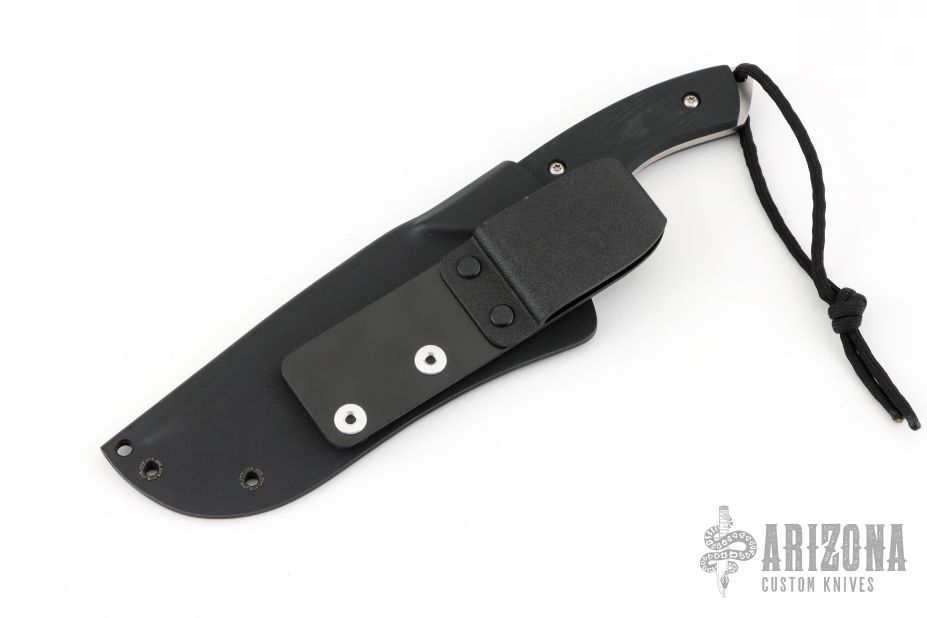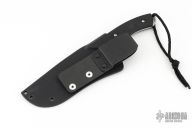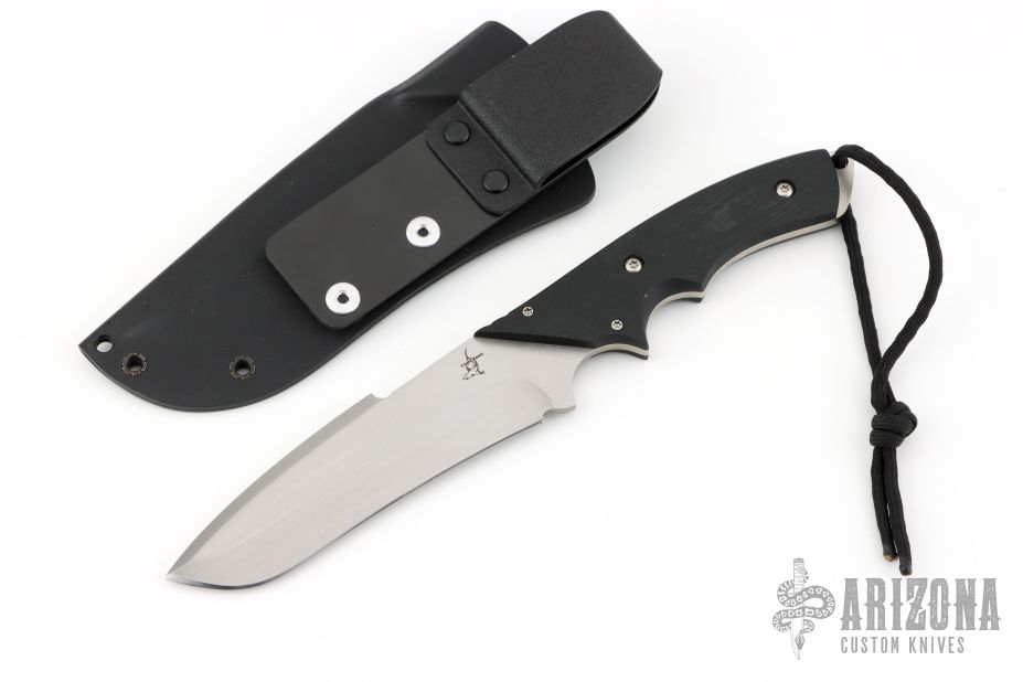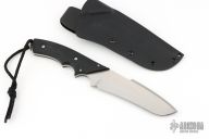 This Operative by Greg Lightfoot features a hand rub satin finished blade with false top edge and a notched thumbrest, .149" blade thickness and 1.402" blade depth, full tang construction. The handle has black G-10 scales with lanyard hole. Comes with a kydex sheath. Has a couple light scratches, otherwise excellent condition.