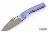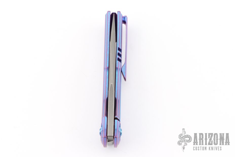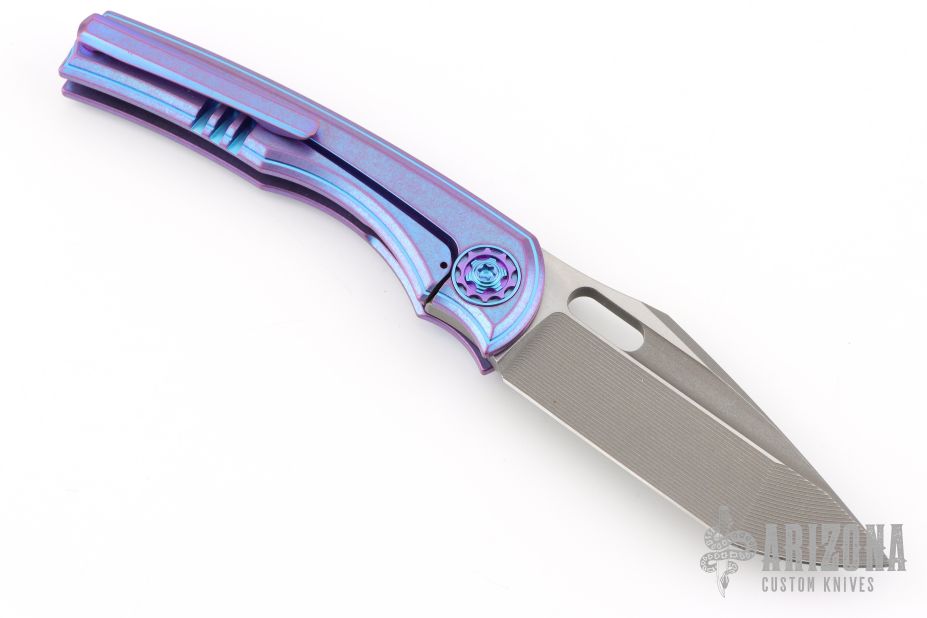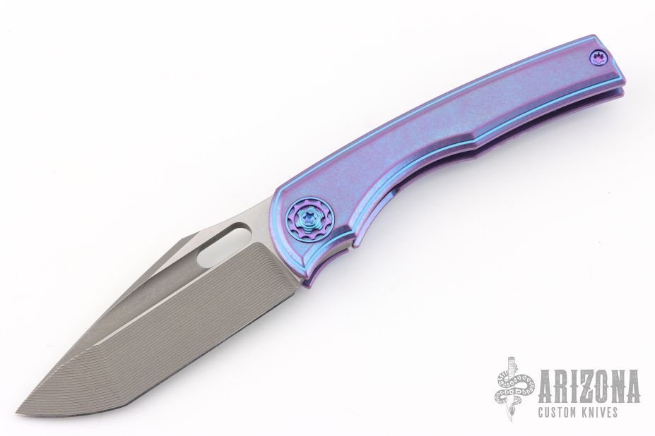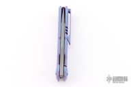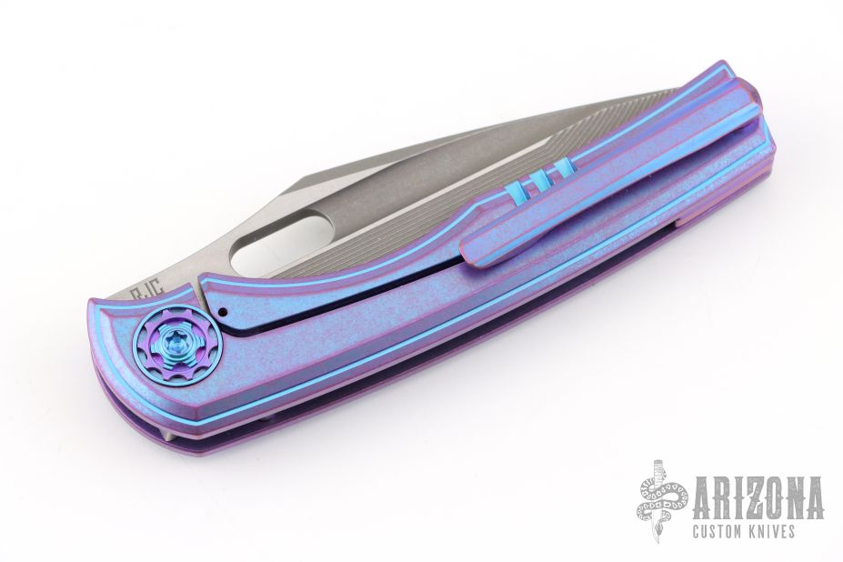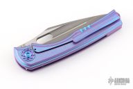 This BBM V2 by Nick Chuprin and Robert Carter features an acid etch blade with fullers, thumbhole and milled bevels. The handle has a tumbled and anodized titanium frame, titanium pivot, screws, collar, backspacer and tip up clip with hidden screws. Rides on bearings, nice detent, lockup and blade seating. Comes with a zippered case. Excellent condition.