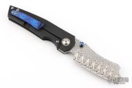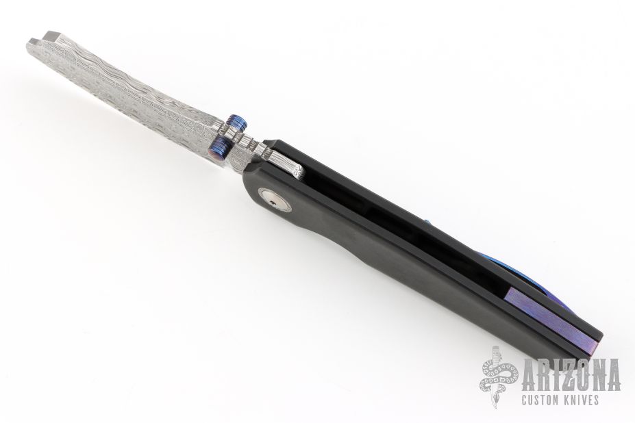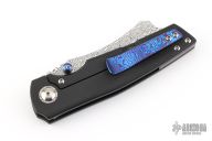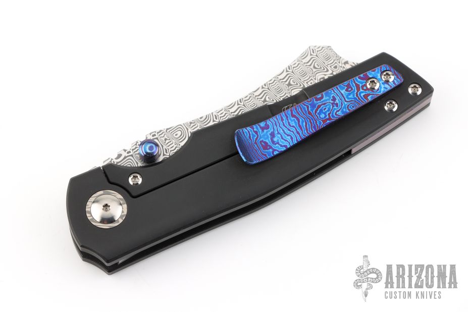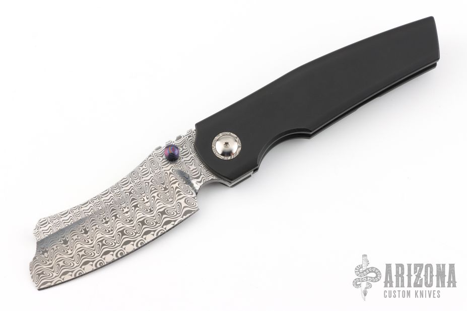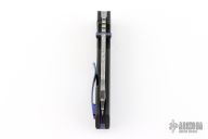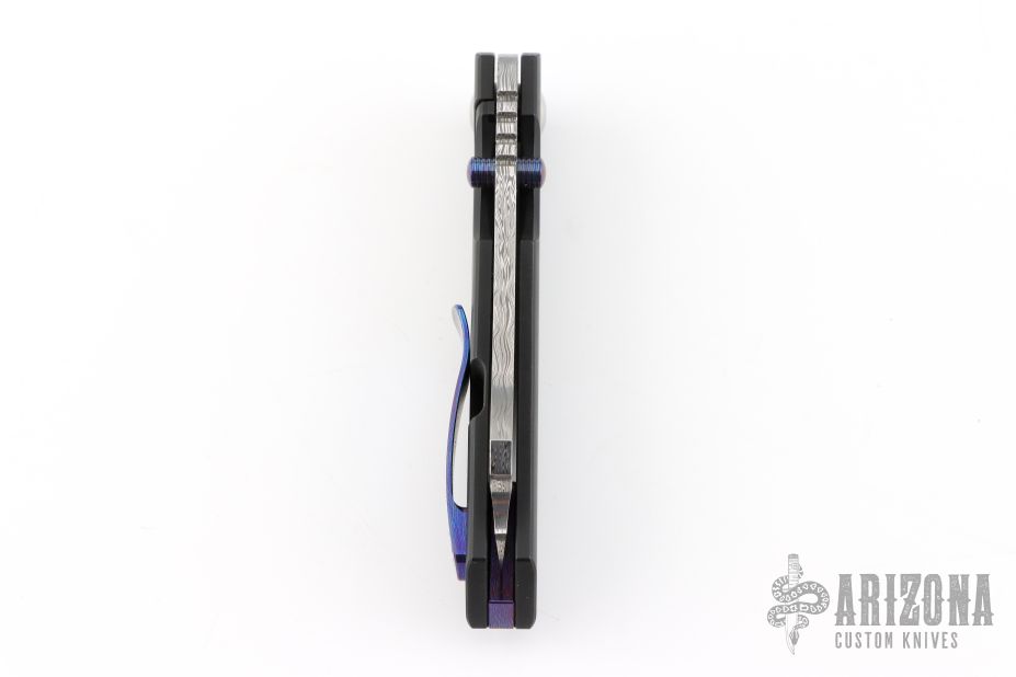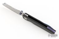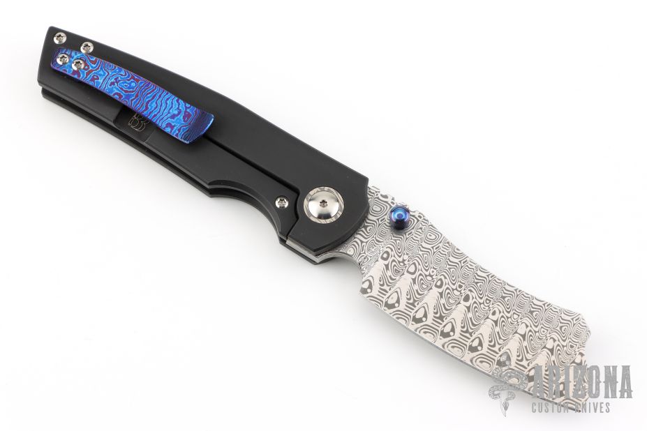 This Production Barber by Berg Blades features a Damasteel blade with notched thumbrest and dual timascus thumbstuds. The handle has a darkened stonewashed titanium frame with Timascus backspacer and tip up clip. Comes with maker's pouch and COA. Nice detent, lockup and blade seating. Excellent condition.