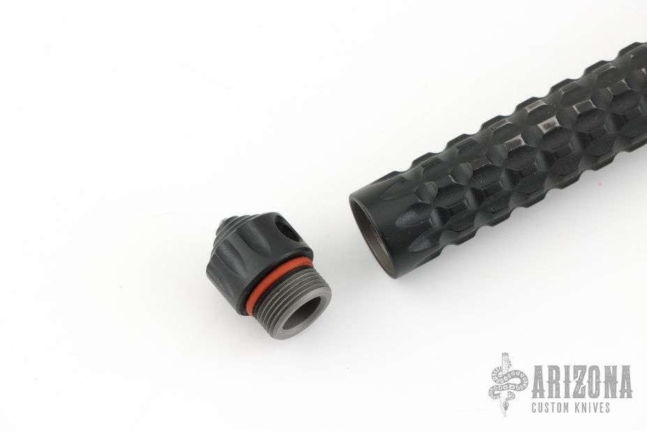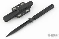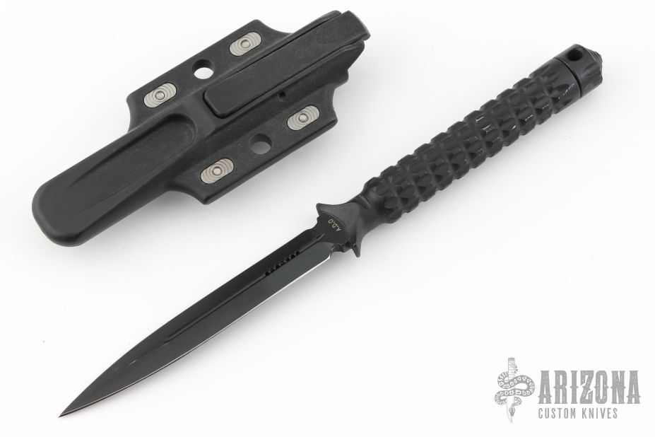 Tactical black ADO made from a single steel billet. Black double edge dagger blade with textured handle. Blade is 5/32" thick and 17/32" deep.  Removable end cap with small storage area. Sheath with belt clip dated 02/2012. Has a couple light scuffs, and some minor wear on the handle finish, otherwise excellent condition.