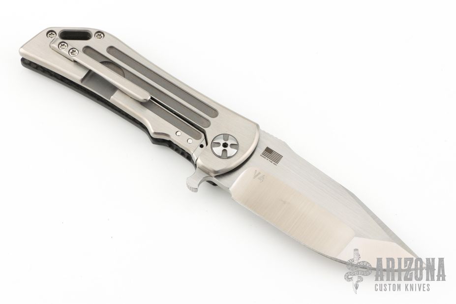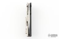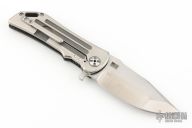 This Dominator by Darrel Ralph features a satin finished, compound ground clip point blade with swedge, notched thumb ramp and flipper. The handle is comprised of a carbon fiber "A" side scale and titanium lockside with carbon fiber tip up clip over a titanium back spacer. Lanyard hole in pommel. Excellent condition. Comes with maker's zippered case and original box.