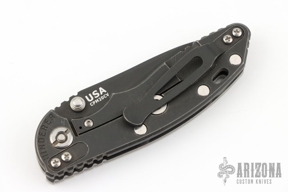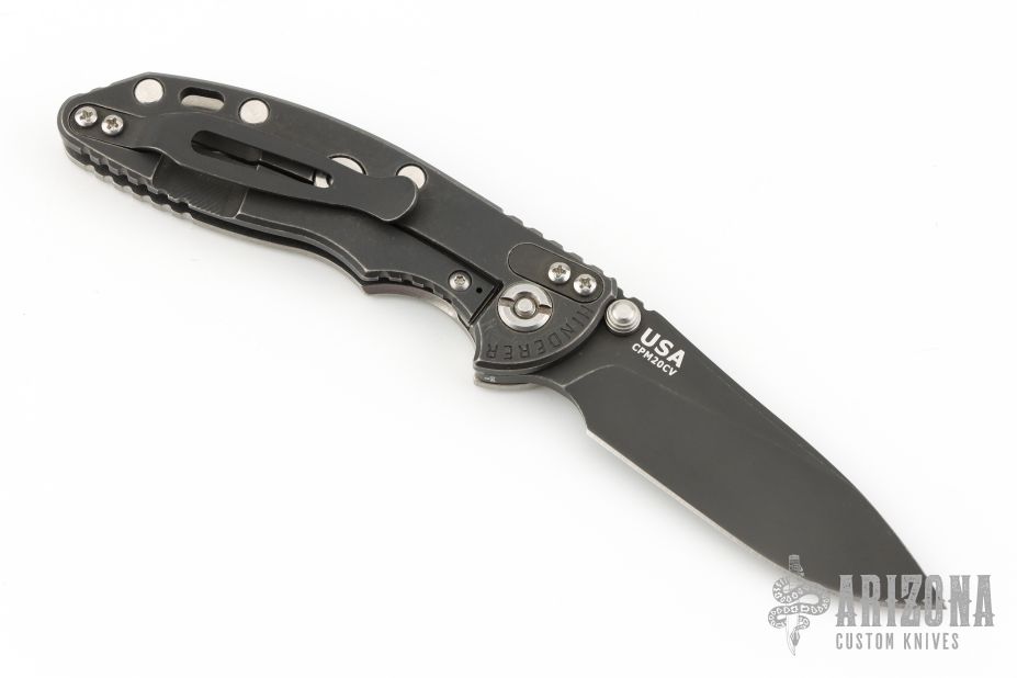 This XM-18 by Rick Hinderer features a black finished blade with notched thumbrest and flipper. The handle has a black stonewashed titanium frame, textured titanium scale, tip up or down reversible titanium clip and filler tab. Comes with original box, papers, original black/blue G-10 scale and extra washers. Excellent Condition.