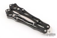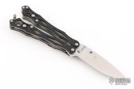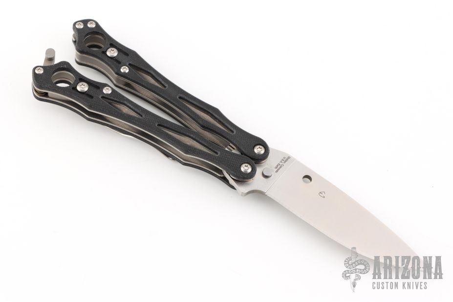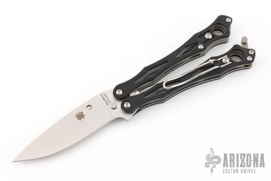 This Spyderfly 2 Balisong by Spyderco has a satin finished blade. Handle is black G10 over stainless steel liners and stainless steel paper-clip style pocket clip. Comes with original box. Excellent condition.