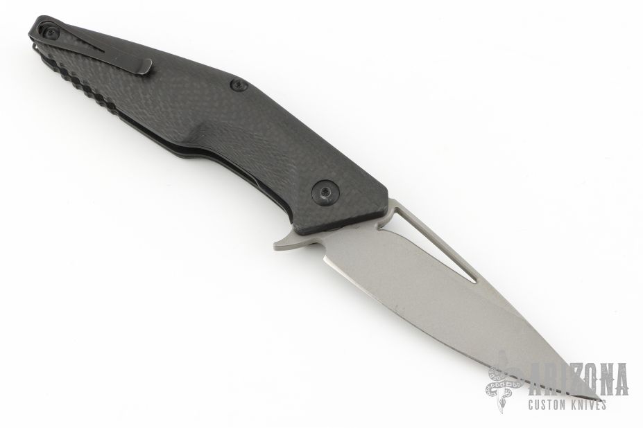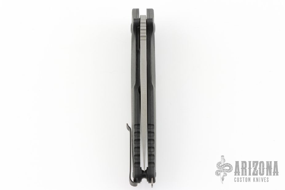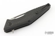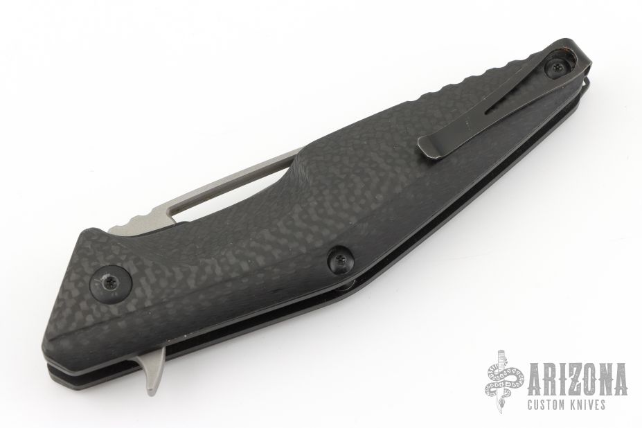 This Division Flipper 307/500 by Brous Blades has a matte black finished D2 tool steel blade with notched thumbrest. Handle is carbon fiber scales over black titanium liners, black stainless steel tip up clip and lanyard loop, and all black hardware. Excellent condition. Comes with original packaging and CoA.