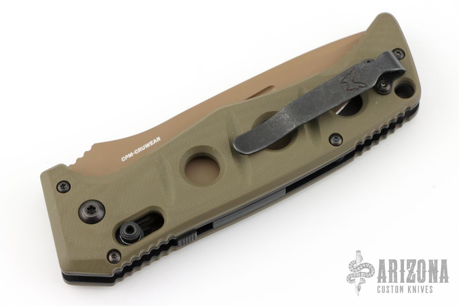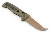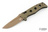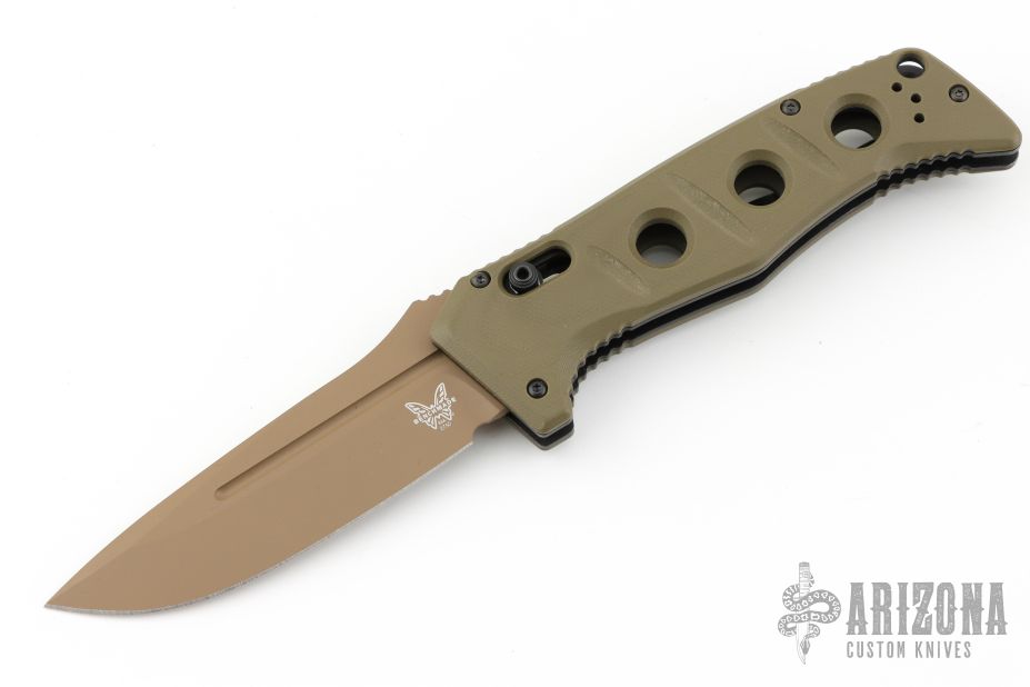 This Siebert designed 2750FE-2 Adamas Auto Axis Lock has a FDE coated drop point blade with fullers and notched thumbrest. Handle is OD G-10 over black stainless steel liners, reversible tip up black stainless steel clip, and spine safety button.  Includes tan nylon sheath. Comes with a Benchmade box and papers. Excellent condition.