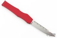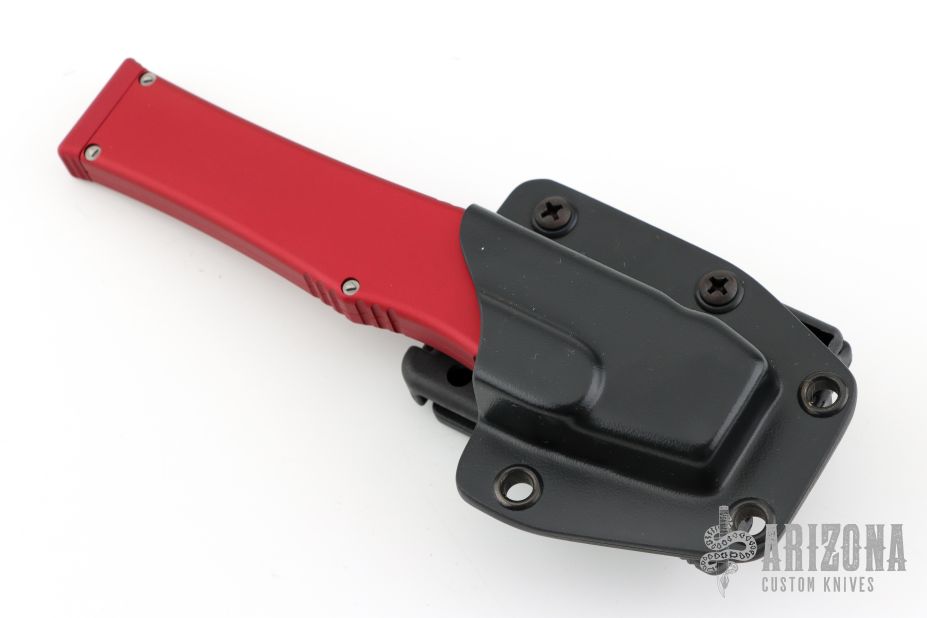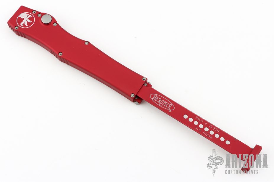 This Halo V OTF automatic has a satin finished blade with a standard edge. Red aluminum handle. Comes with original box, papers and kydex sheath with TekLok. Dated 11/2014 and S/N 07844. Excellent condition.