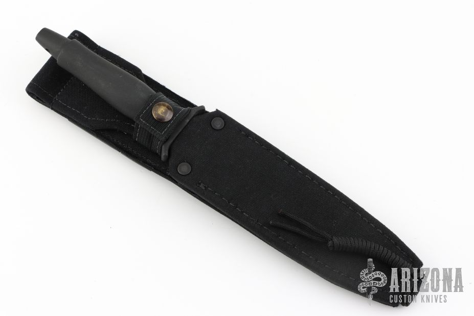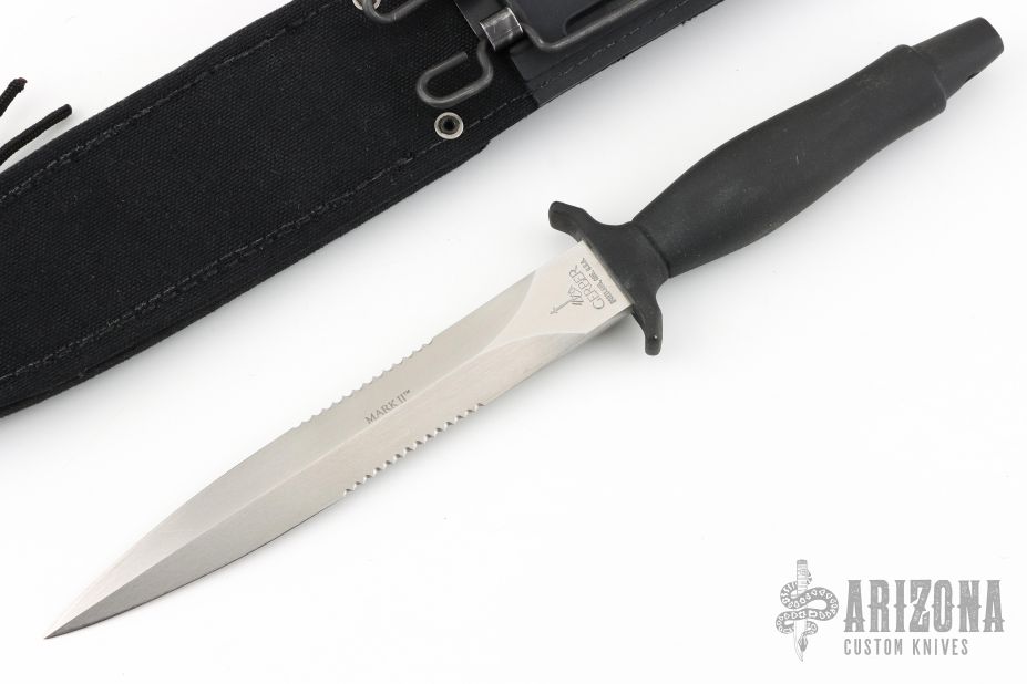 The Mark II is one of the best selling knives of all time. First introduced in 1966, this tactical knife is serialized for collectors. Satin finished double edged blade, .243" blade stock and .973" blade depth, hidden tang construction with a black aluminum handle. This knife is Serial #I9453S. Made in 1990. Comes with original black nylon sheath. Has light scratches and some minor wear on the handle, excellent condition otherwise.