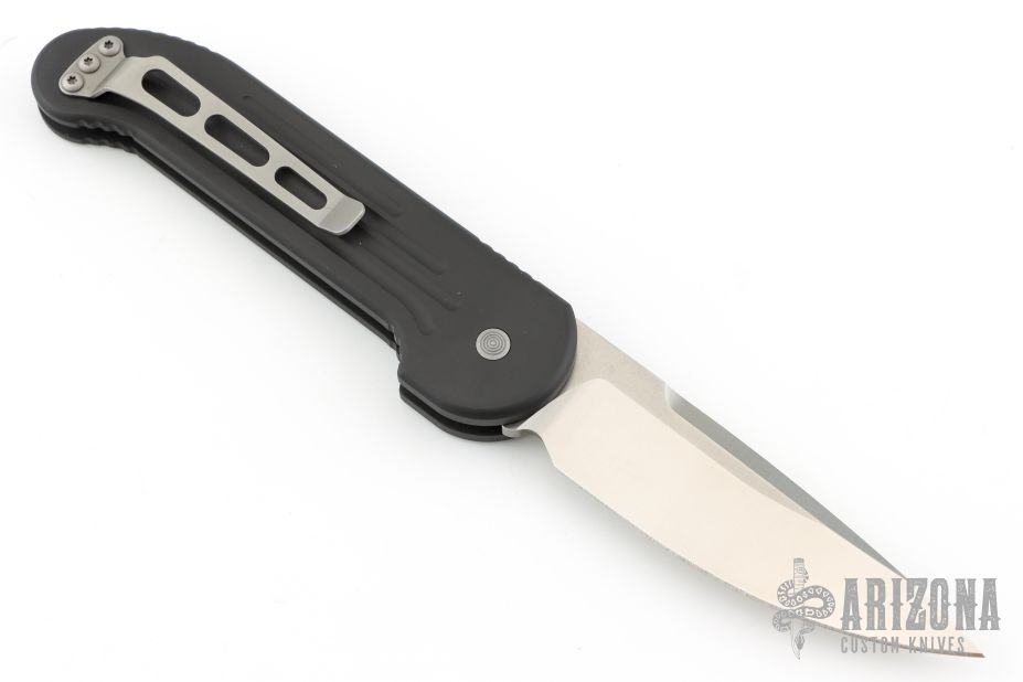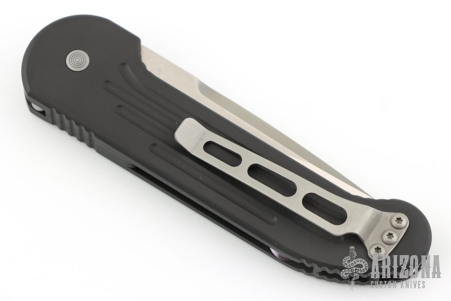 This LUDT is dated 05/2001 with Serial #1857. Satin plain edged blade. Side opening coil-spring automatic. Black aluminum handle with reversible tip up stainless steel clip. Comes with original sheath, box and papers. Excellent condition.