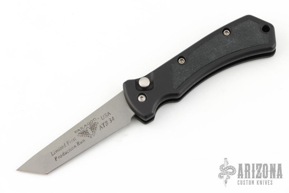 This Side-opening coil spring automatic by Paragon features a bead blast chisel ground tanto blade. Black aluminum frame with rubber inlays. Has a couple light scuffs, otherwise excellent condition.