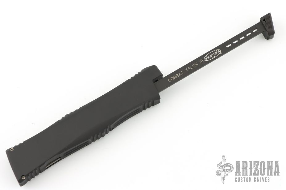 This Combat Talon III has a stonewashed double edged partially serrated stonewashed blade. Push button automatic opening. Closes via a reverse charging handle in the rear of the frame. Contoured frame grip with milled ribbing on the frame spine and belly. Serial #027 and dated 06/2003. Comes with original box, papers, and nylon sheath. Excellent condition.