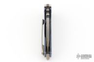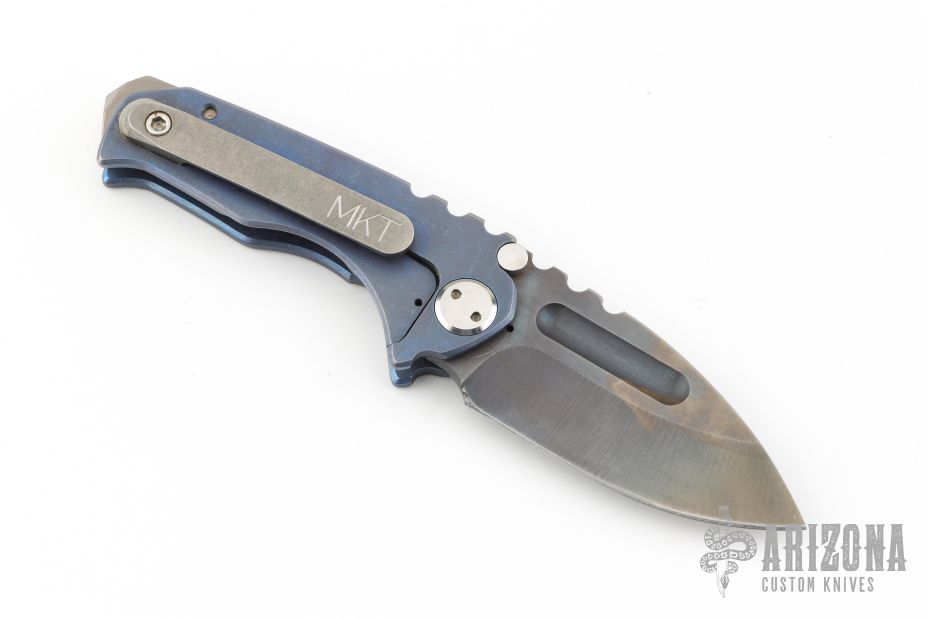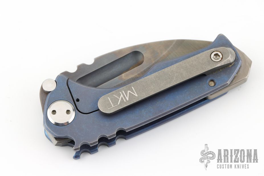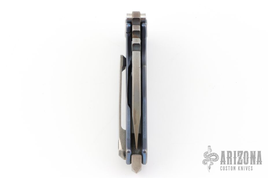 This Micro Praetorian from Medford Knife and Tool features a Vulcan finished drop point blade with notched thumb rest and ambidextrous finger groove. The frame is comprised of stonewashed blue anodized titanium with stonewash titanium tip up pocket clip. Stainless steel backspacer doubles as a glass breaker. Has some light scratches/scuffs, otherwise good condition.