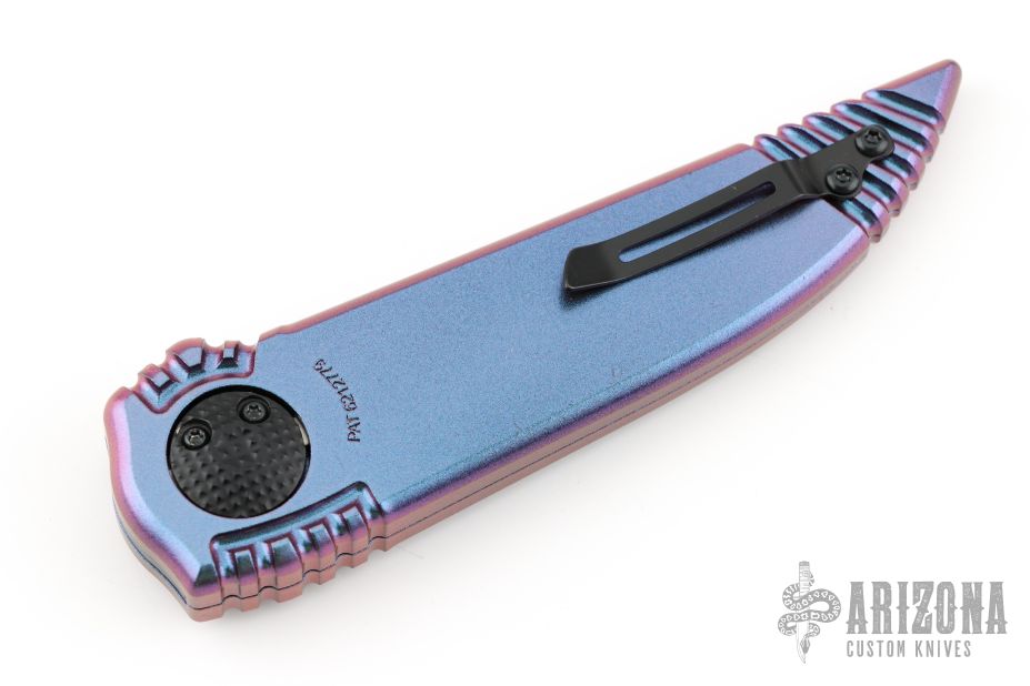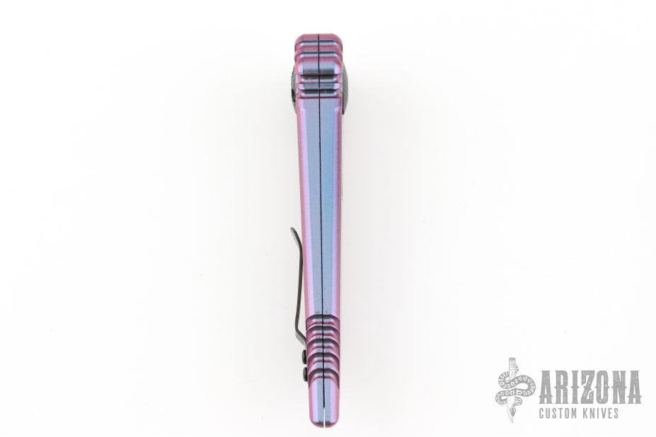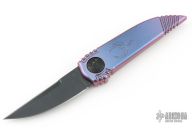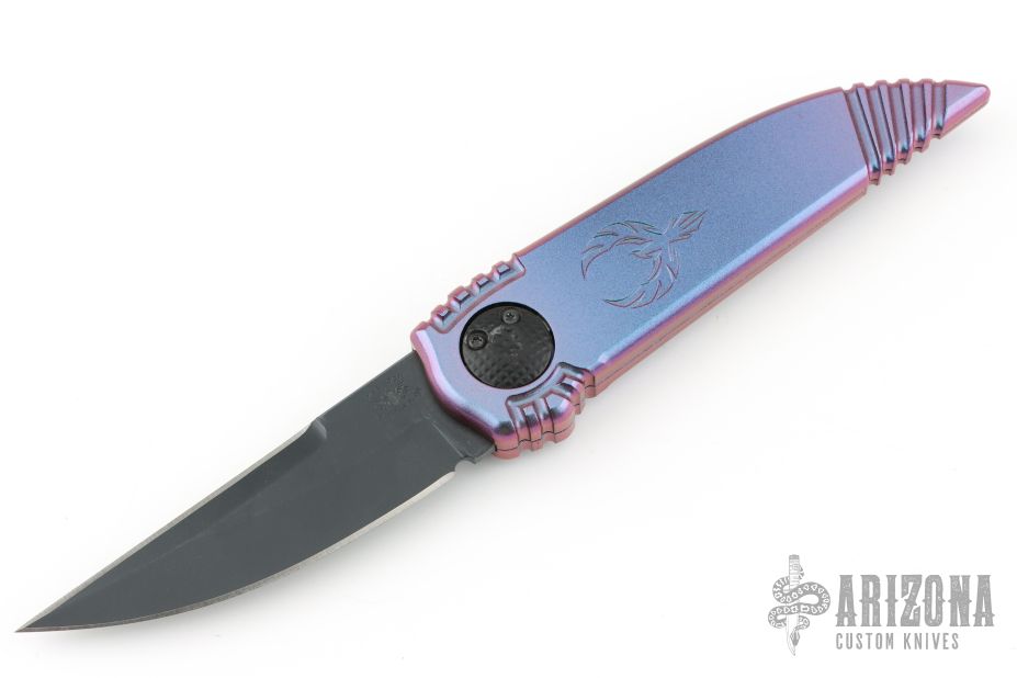 This Phoenix model sports a blurple handle with a phoenix laser etching and a CPM-S30V steel blade with a black cerakote finish. The top edge of the knife has been sharpened.