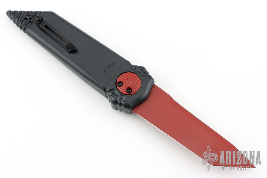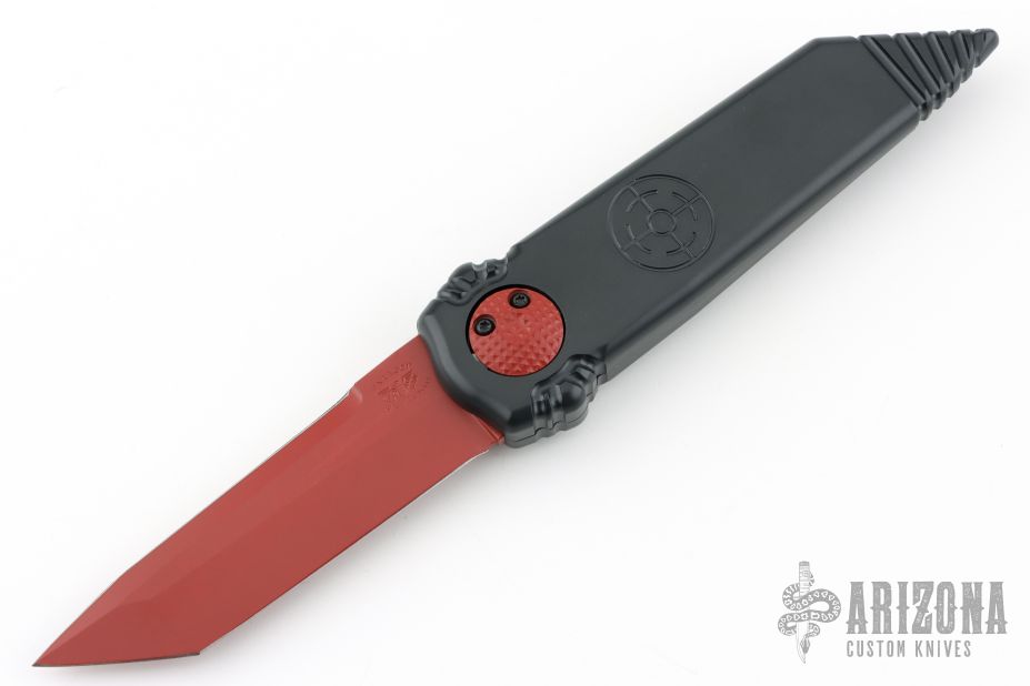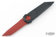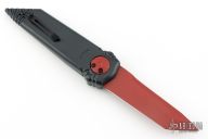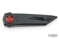 This Dreddlock model sports a black handle with a bullseye laser etching and a CPM-S30V steel blade with a red cerakote finish. The top edge of the knife has been sharpened.