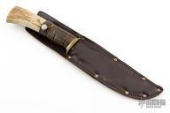 This hunter by William Scagel we believe was made around 1915ish era. It has a carbon steel blade with his stamp, .168" blade stock and 1.050" blade depth, hidden tang construction. The handle has a reduced brass guard, stag butt with brass pin, and a spacer pattern consisting of leather/brass/red. Comes with original black leather sheath and a zippered case. Has some light scratches and patina, has some light pitting on the blade, otherwise good condition for a 100+ year old knife!