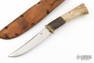 William (Bill) Wales Scagel (1873-1963). Considered to be the foremost pioneer in 20th century custom knifemaking. Scagel began making knives in 1910 while working at lumber camps throughout Michigan and Canada. From 1920 through 1929, Scagel sold his knives through Abercrombie & Fitch of New York and their subsidiaries such as Von Lengerke & Antoine. Scagel made hunting knives, machetes, and axes for the expeditions of the Smithsonian Institution. Scagel made a variety of knives throughout his career including bowie knives, fighting knives, and pocketknives. Scagel used a half stag and half leather stacked washer assembly in his knife handles that became his trademark style. One such Scagel knife provided the influence for Bo Randall to start making his own knives. In 1937, Randall witnessed someone using a Scagel knife to scrape paint off of a boat without damaging the edge of the blade. Randall bought the knife and in the years that followed Scagel became a mentor to Randall, influencing many of his designs. Every knife Scagel made was completely by hand and without modern tools such as a grinder or buffer, his shop was powered off a gasoline engine from an automobile and as a result, the quantity of knives he produced over his 50 years of knifemaking is very low. He made his last knife in 1962, the year before he died. Twenty-three years later he was inducted into the Blade Magazine Cutlery Hall of Fame in 1989. In 1996, Scagel was inducted into the American Bladesmith Society Hall of Fame.
