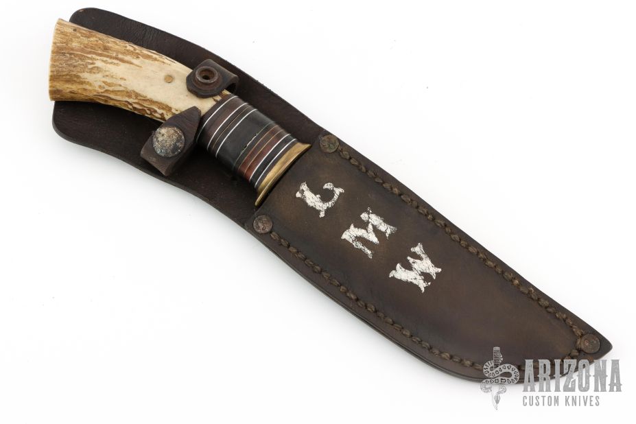 This hunter by William Scagel we believe was made around 1915ish era. It has a carbon steel blade with his stamp, .179" blade stock and 1.135" blade depth, hidden tang construction. The handle has a reduced brass guard, stag butt with 2 brass pins, and a spacer pattern consisting of leather/brass/aluminum. Comes with original black leather sheath and a zippered case. Has some light scratches and patina, has some light pitting on the blade, has a couple of small gaps in the spacers, otherwise good condition for a 100+ year old knife!