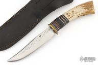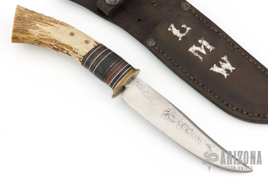 William (Bill) Wales Scagel (1873-1963). Considered to be the foremost pioneer in 20th century custom knifemaking. Scagel began making knives in 1910 while working at lumber camps throughout Michigan and Canada. From 1920 through 1929, Scagel sold his knives through Abercrombie & Fitch of New York and their subsidiaries such as Von Lengerke & Antoine. Scagel made hunting knives, machetes, and axes for the expeditions of the Smithsonian Institution. Scagel made a variety of knives throughout his career including bowie knives, fighting knives, and pocketknives. Scagel used a half stag and half leather stacked washer assembly in his knife handles that became his trademark style. One such Scagel knife provided the influence for Bo Randall to start making his own knives. In 1937, Randall witnessed someone using a Scagel knife to scrape paint off of a boat without damaging the edge of the blade. Randall bought the knife and in the years that followed Scagel became a mentor to Randall, influencing many of his designs. Every knife Scagel made was completely by hand and without modern tools such as a grinder or buffer, his shop was powered off a gasoline engine from an automobile and as a result, the quantity of knives he produced over his 50 years of knifemaking is very low. He made his last knife in 1962, the year before he died. Twenty-three years later he was inducted into the Blade Magazine Cutlery Hall of Fame in 1989. In 1996, Scagel was inducted into the American Bladesmith Society Hall of Fame.