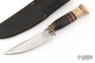 This hunter by William Scagel we believe was made around 1915ish era. It has a carbon steel blade with part of his stamp remaining, .151" blade stock and 1.371" blade depth, hidden tang construction. The handle has a reduced brass guard, crown stag butt with a brass pin, and a spacer pattern consisting of leather/brass/red/aluminum. Comes with original black leather sheath and a zippered case. Has some light scratches and patina, has some light pitting on the blade, has a couple of gaps in the spacers, otherwise good condition for a 100+ year old knife!