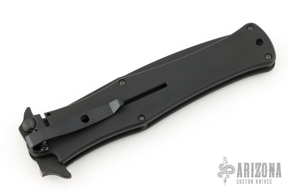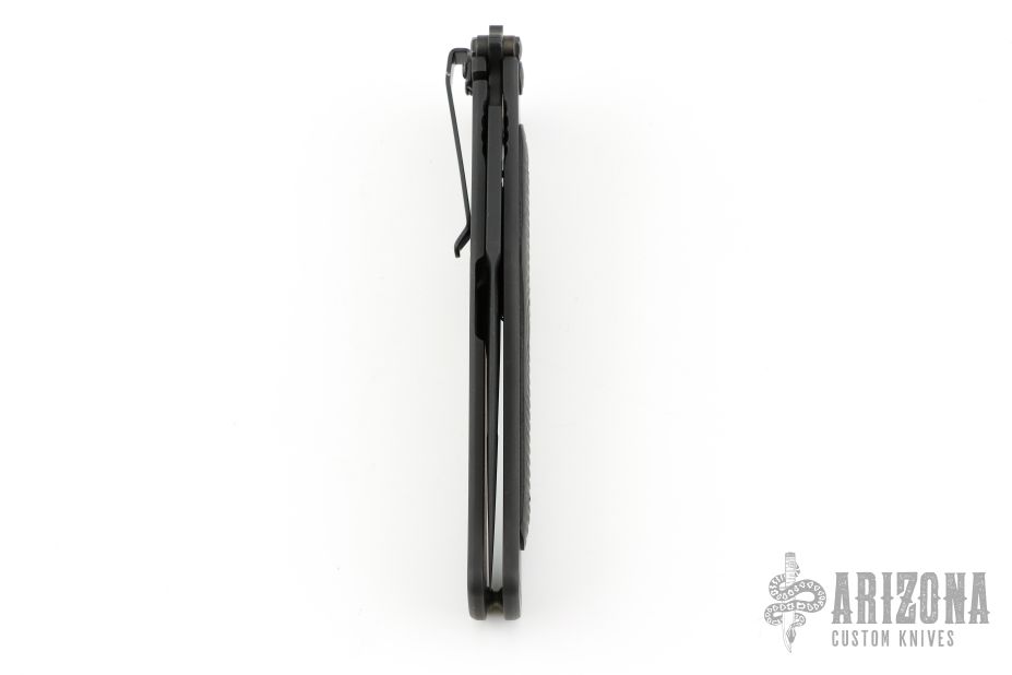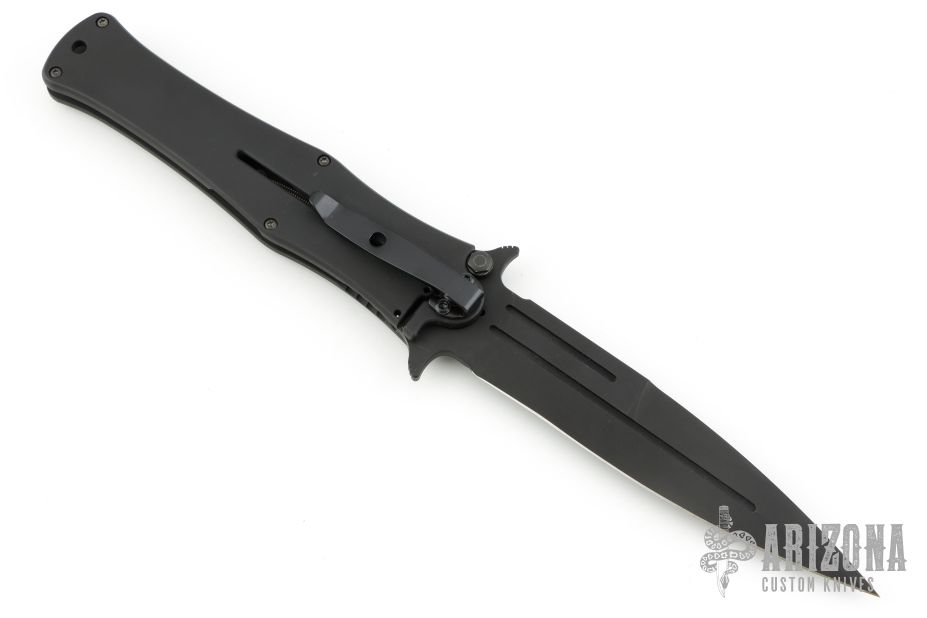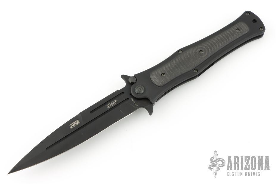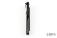 This Madd Maxx 5.5" Assisted Flipper is a Darrel Ralph Design executed by HTM Knifes. It features a black coated bayonet ground blade with false top edge, fullers, dual thumb studs and flipper. The handle is comprised of a blackened titanium frame with carbon fiber overlay over barrel spacers. Black coated steel tip down clip and lanyard hole in pommel. Comes with original box and zipper case. Has some light scuffs and scratches, great condition otherwise.
