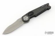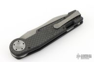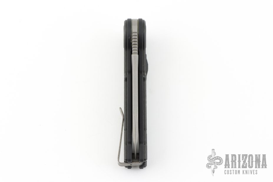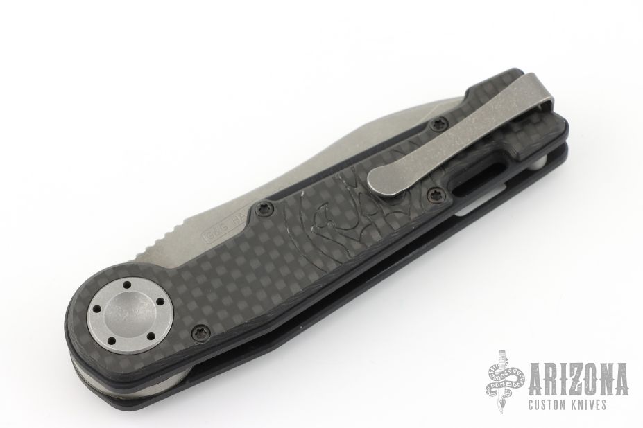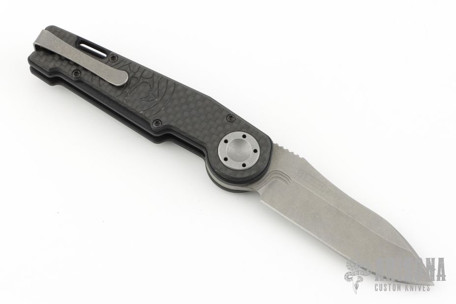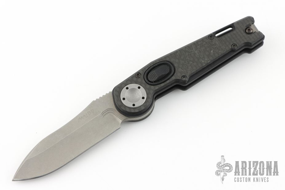 This MUDD Auto folder from Grant and Gavin Hawk features a bead blast finished spear point blade with notched thumb ramp. The handle has textured and engraved carbon fiber scales, black finished titanium frame, tip up reversible tumble finished titanium clip. Nice lockup and blade seating. Has a couple light scuffs, excellent condition otherwise.