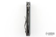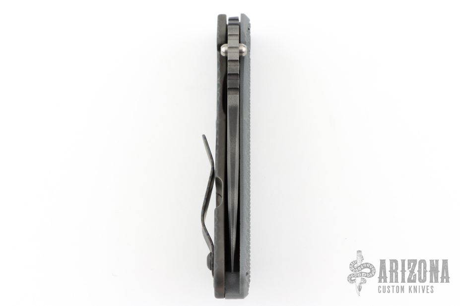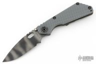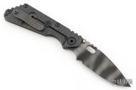This SNG framelock folder by Mick Strider features a Magnacut tiger stripe blade and a dimple pattern gray G-10 and flamed titanium frame and tip up titanium clip. Includes a "Lock Bar Stabilizer" for maximum reverse lock retention. Nice detent, lockup and blade seating. Excellent condition.