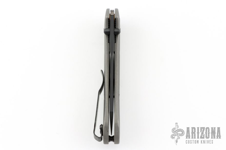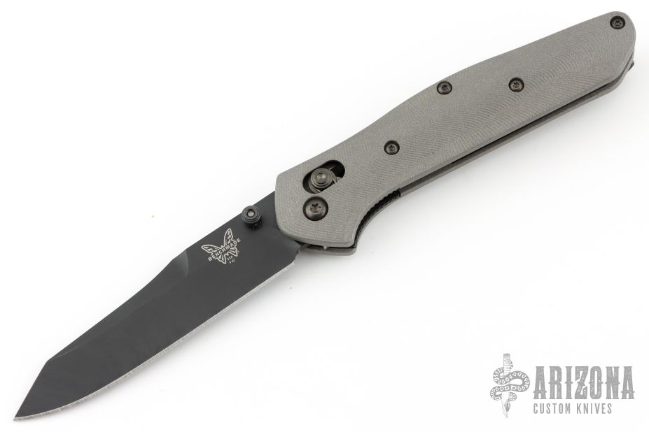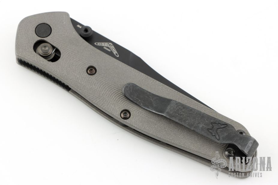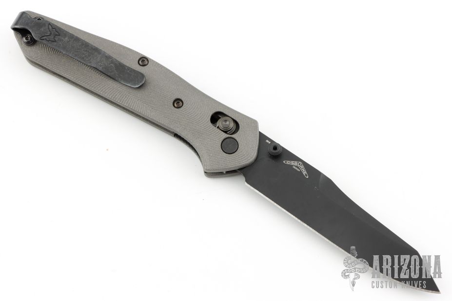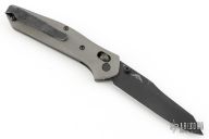 This 940BK Osborne Axis Lock Folder from Benchmade has a black coated clip point blade with false top edge and dual thumbstuds with trit insert. Handle is RSD titanium with black hardware, standoffs, and a black finished stainless steel tip up clip (RH/LH Reversible). Excellent condition.