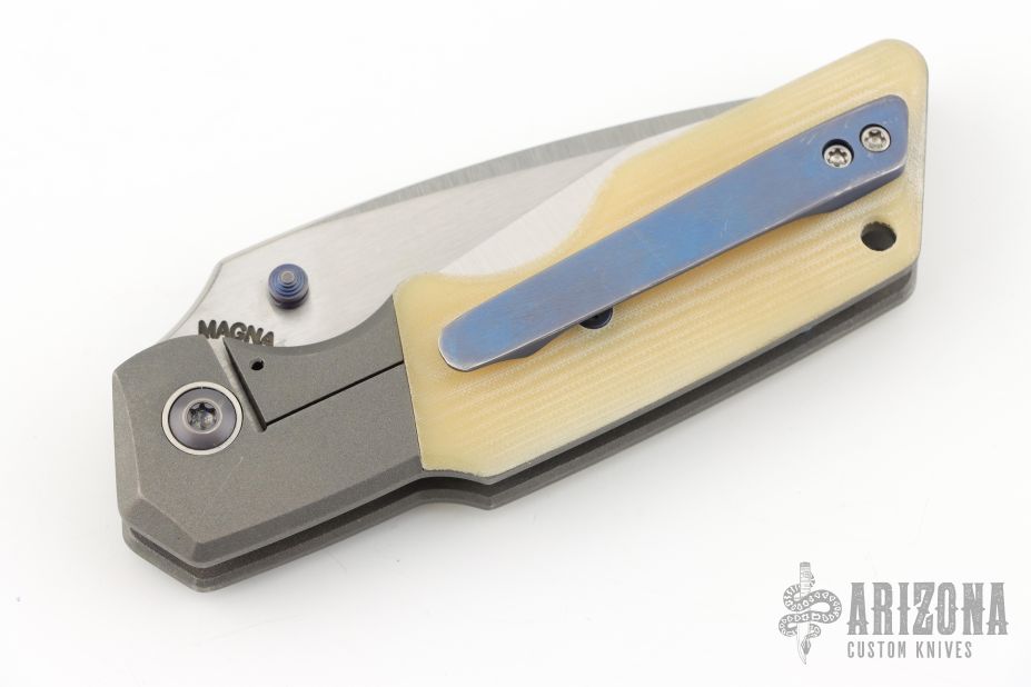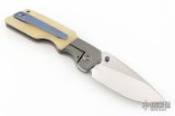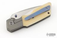 This knife by A2D Mercantile features a satin finished blade with dual anodized thumbstuds and "rising grind". The handle has a bead blast finished titanium frame, micarta covers, satin finished pivot collar, anodized titanium tip up clip, and lanyard hole in pommel. Nice detent, lockup and blade seating. Has some scuffs and scratches, great condition otherwise.