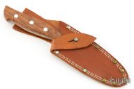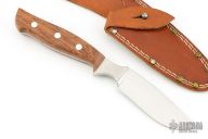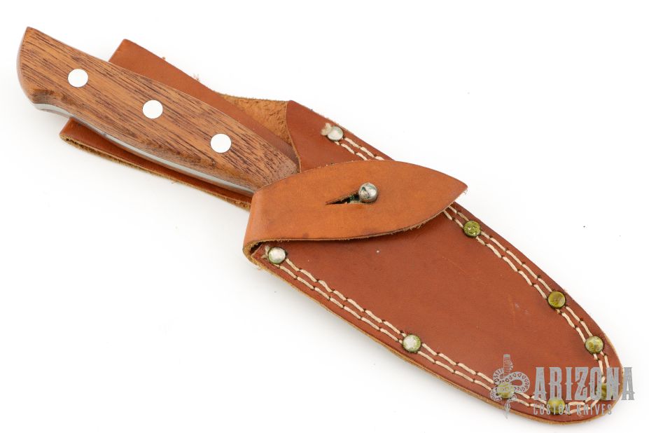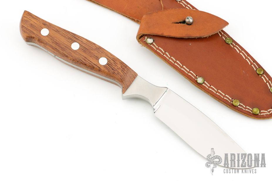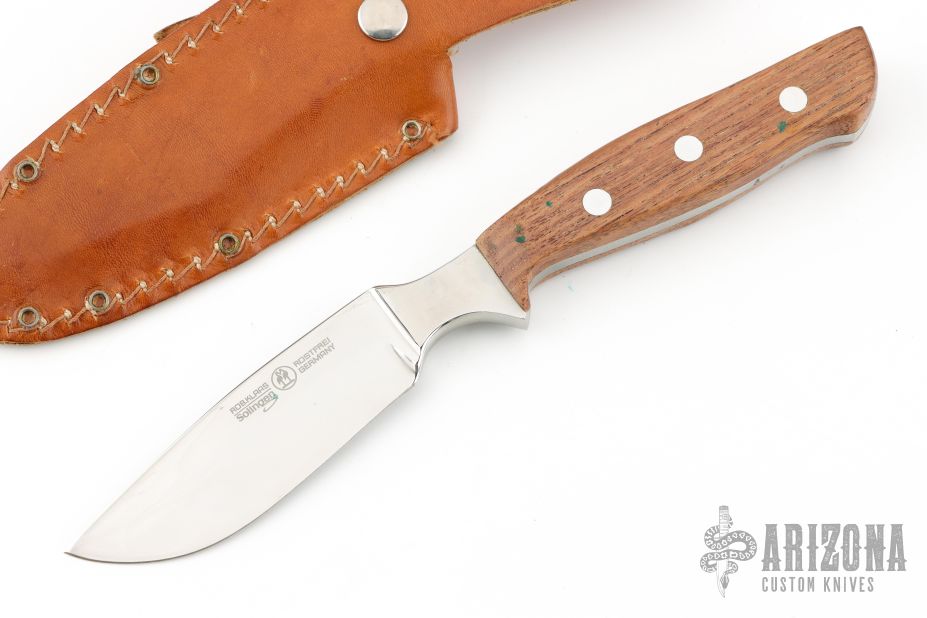 This hunter by Robi Klaas featueres a mirror polished blade with .142" blade stock and 1.139" blade depth, full tang construction. The handle has integral bolsters and wood scales. Comes with a brown leather sheath. Has some light scratches, otherwise good condition.